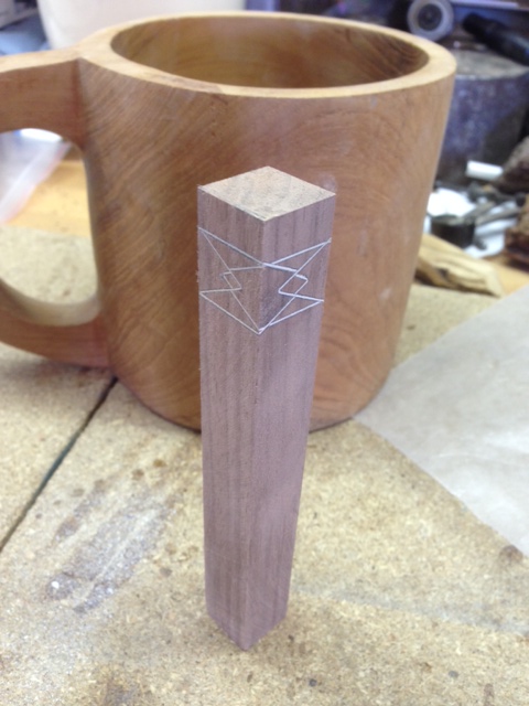 1. Draw a line lengthwise offset from center where you want the points to overlap. I drew mine at about 2/3 just eyeballing where the edge of my pen would be, still wanting the point to show.