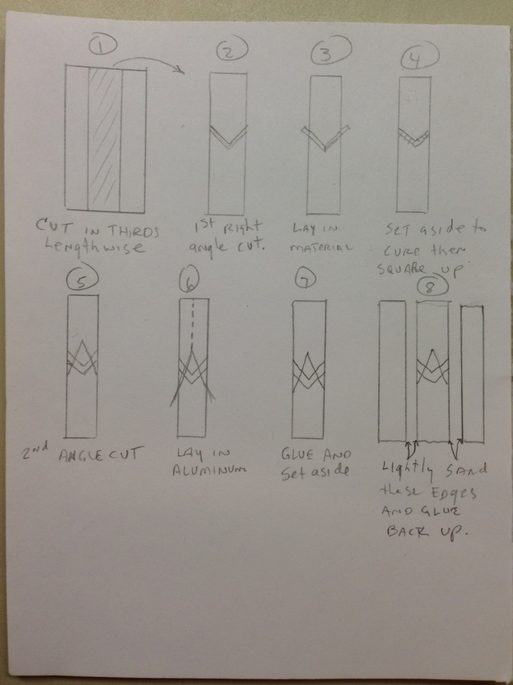 One possible way to rectify the offset, and I haven't tried this or seen it done, is to make a vertical cut from the compass point up to remove some material before you lay in the aluminum. This would narrow the "V" and possibly line the square back up. It would be a trial and error type of operation. Again, I haven't tried this but I just thought of it so maybe it will work. I'll be trying this concept sometime. This will end up narrowing the entire center blank so some thought may have to be put in to see if this modifies the thickness of the initial cuts into the blank ... not sure.