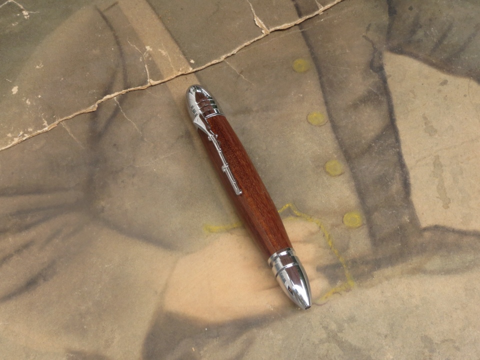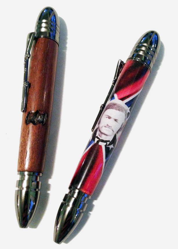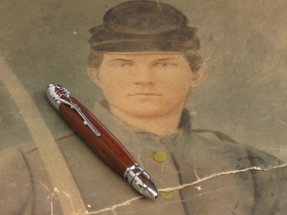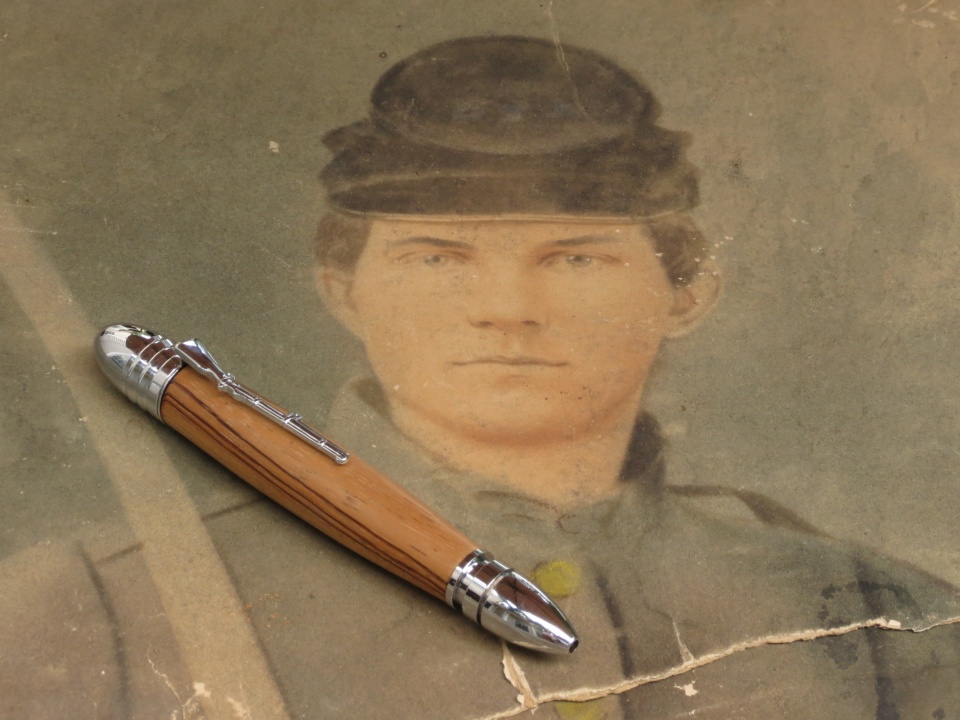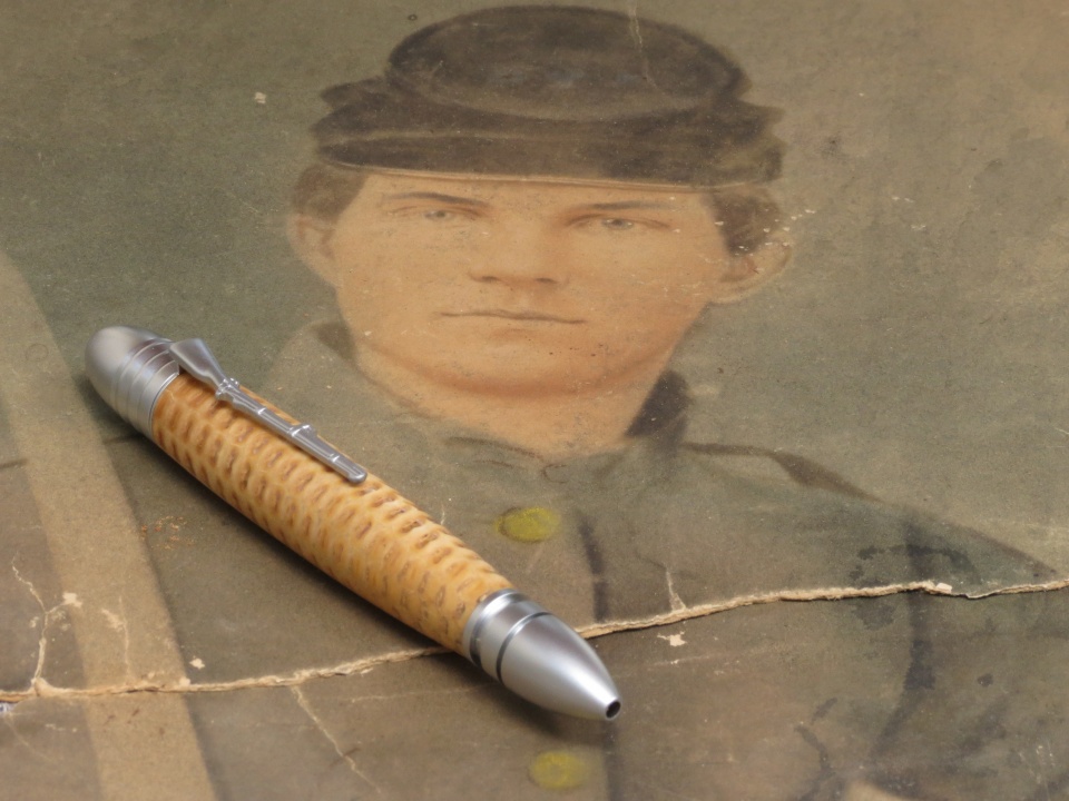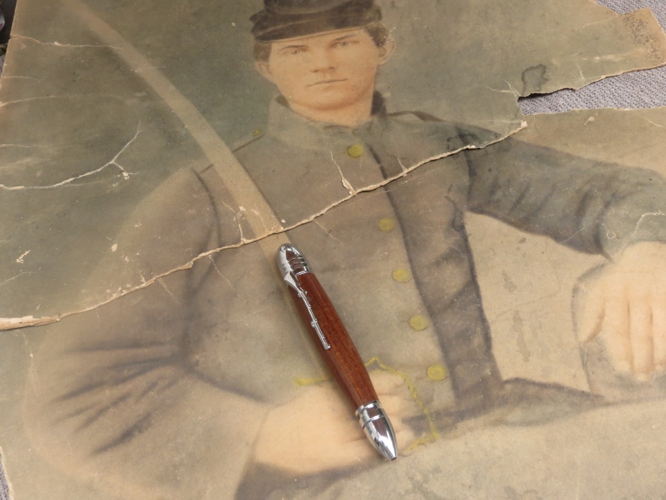 Here's a photo of my gg-grandfather on a blank that Cody Walker (cwalker935) made for me and a pen that I made from one of the musket blanks. This one had a small burned spot that I was able to incorporate into the finished pen - I really like the look of it.