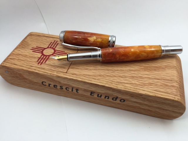 A sweet oak pen holder made on Bobby's CNC machine with the New Mexico logo and state motto "Crescit Eundo" which means "It Grows as it goes". The red is colored epoxy and the lettering is coffee grounds.