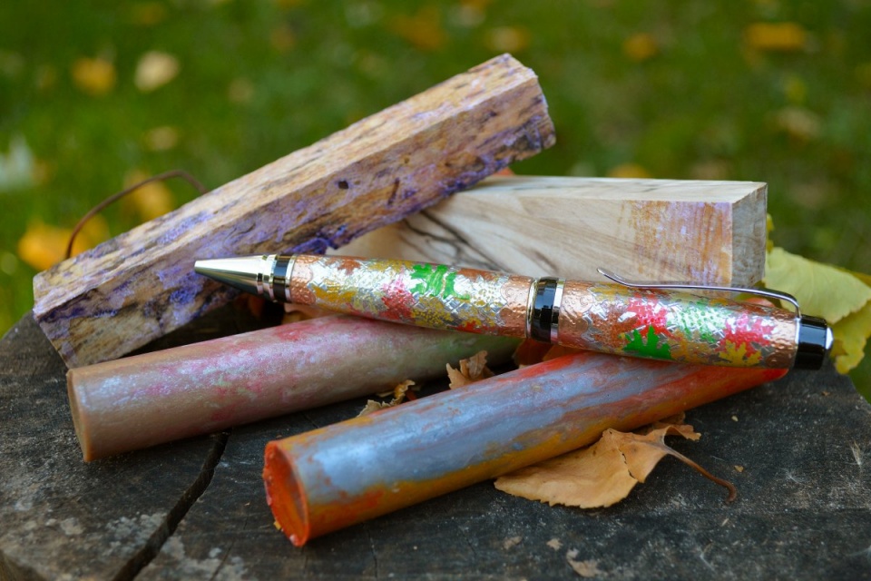 My partner was Brian and I would like to thank him for posting what he sent as my camera is on the fritz. The foliage pen is awesome. The pics do not show all the depth and sparkle. Fit and finish is perfect. Brian hit this one out of the park. The planks are awesome. Can't wait to turn the FOG blank it is awesome. The wife has already claimed the caramel apple blank, guess I better get busy. This has been a great experience. I have been in two PITH and they have been wonderful. I suggest that all members that haven't tried one try the next one.