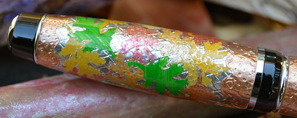 I sent a FOIlage :wink: pen and blanks to Ed. I painted some aluminum foil with Testor's model paint, and then used a scrapbook paper punch to punch foil leaves. I stuck them on the background foil, and cast in Silmar 41. The component set is a CUSA Artisan Cigar.