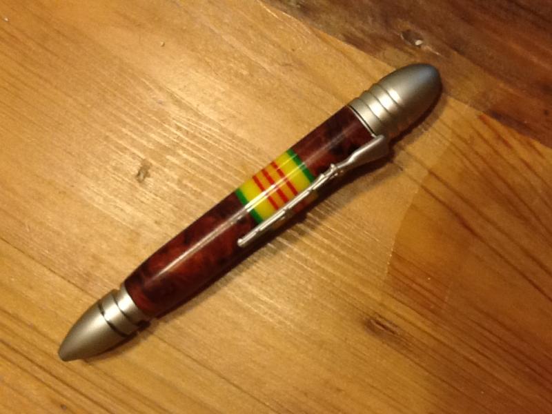 So idea two was to scale the service ribbon colors down and put it in between some nice wood. I had some nice redwood burl blanks, so I used one of those. The result is attached.