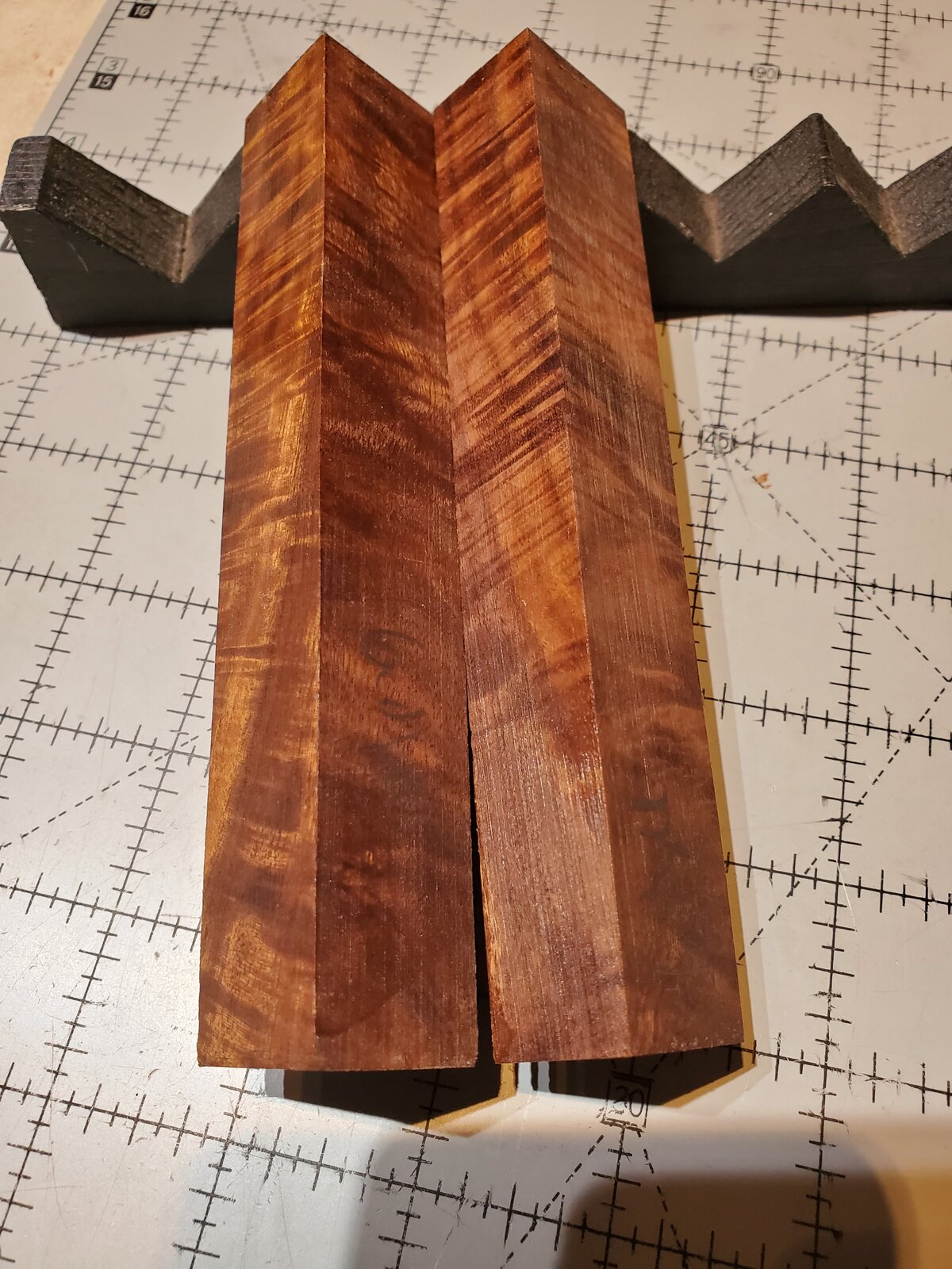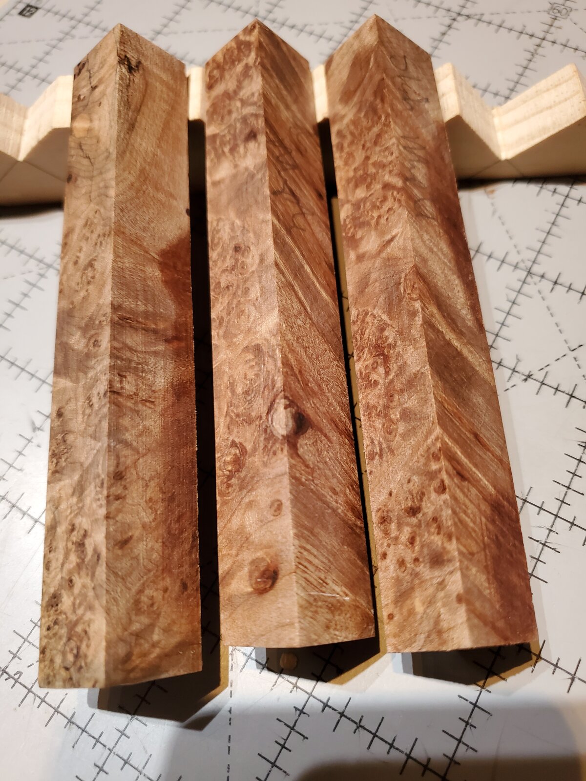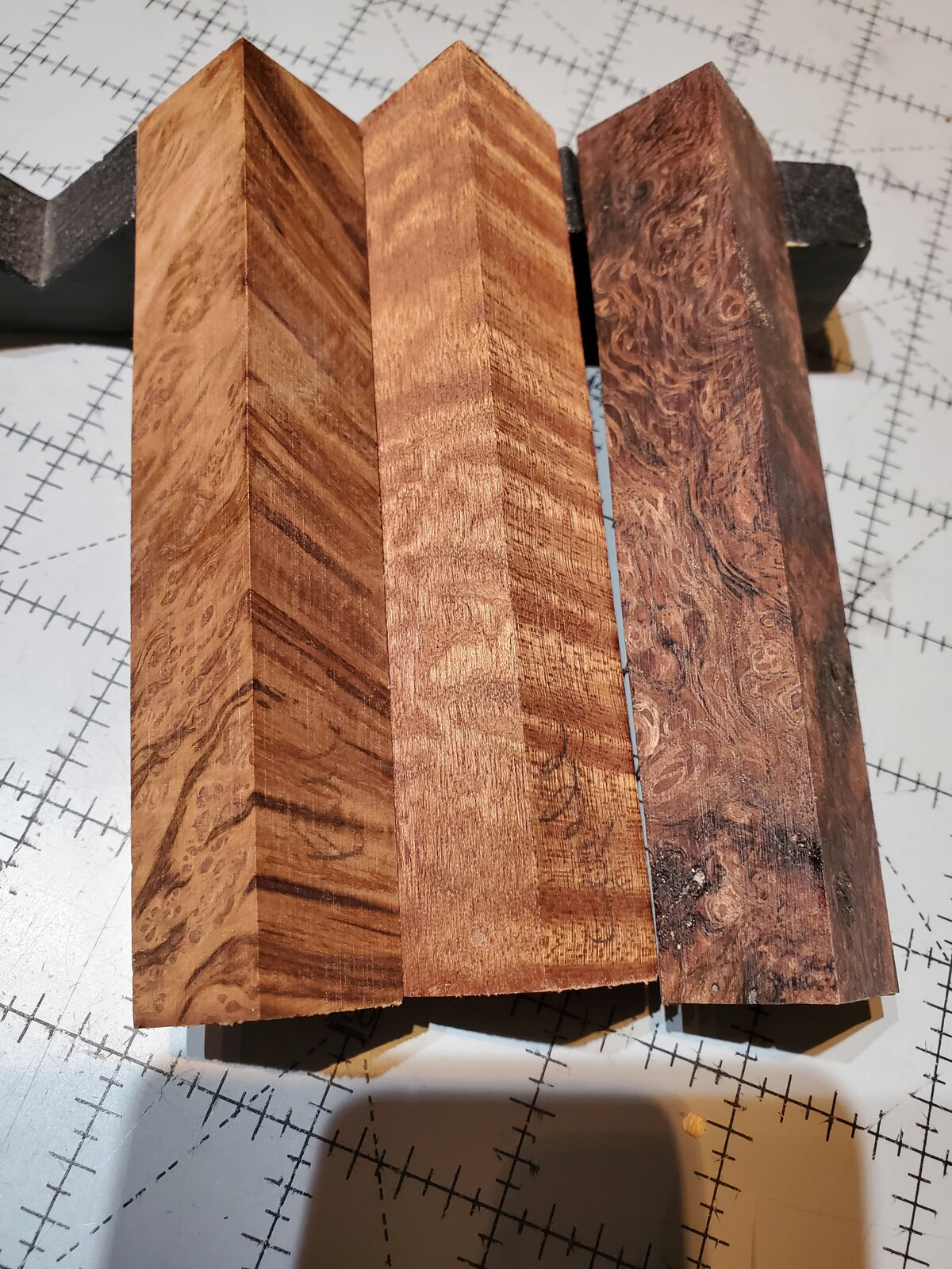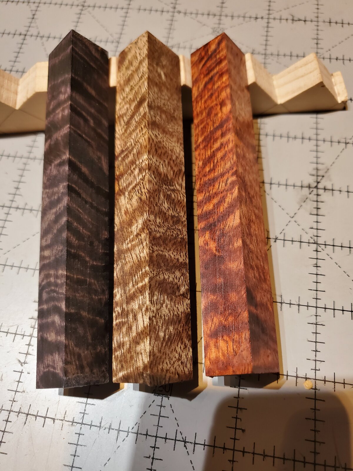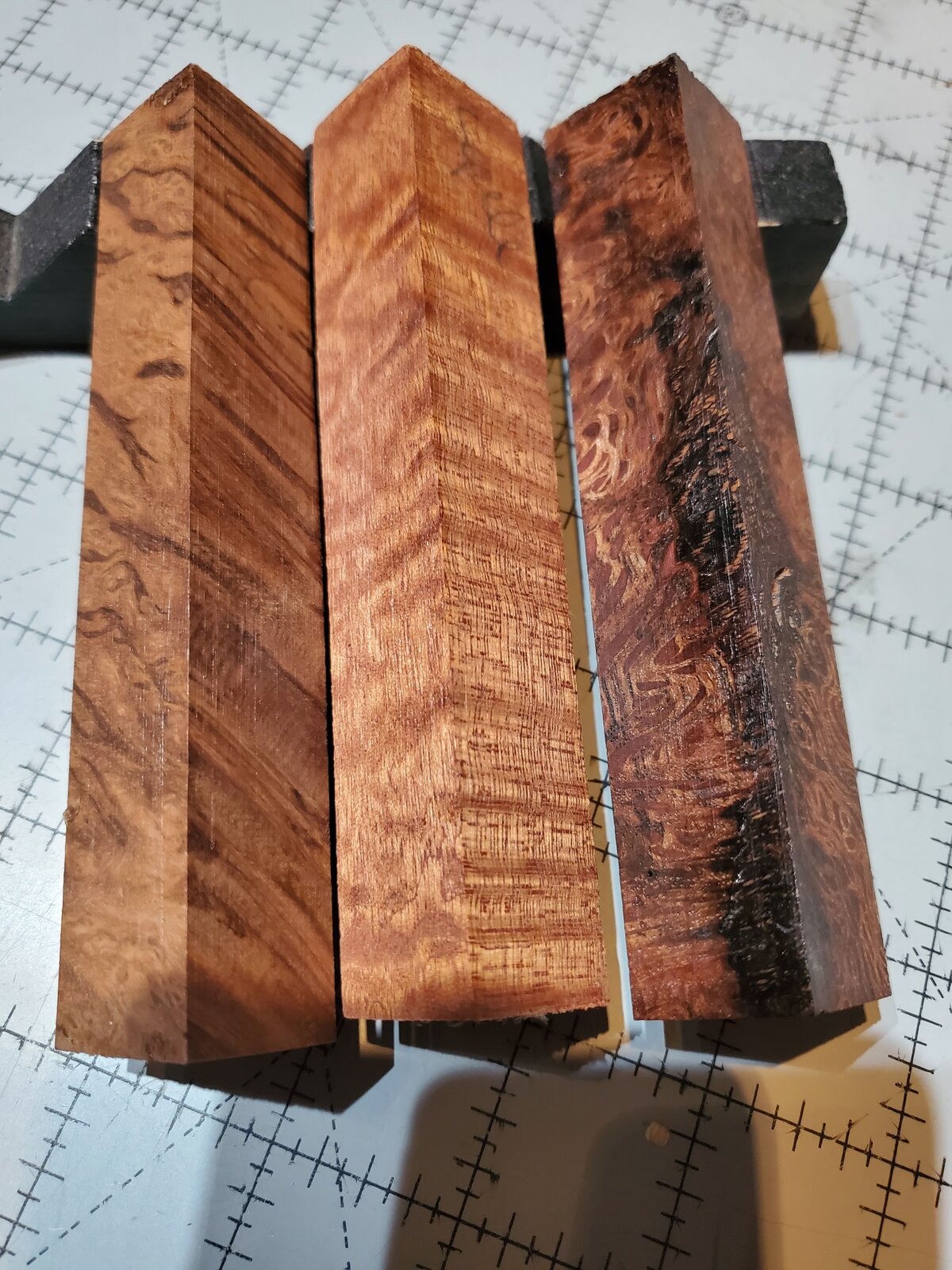 Lot 4: three with funky figure - stabilized spaghetti oak, figured sapele, resin burl, $12