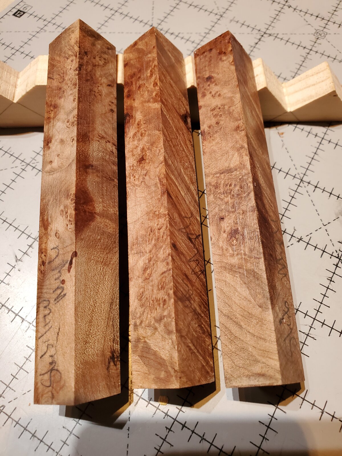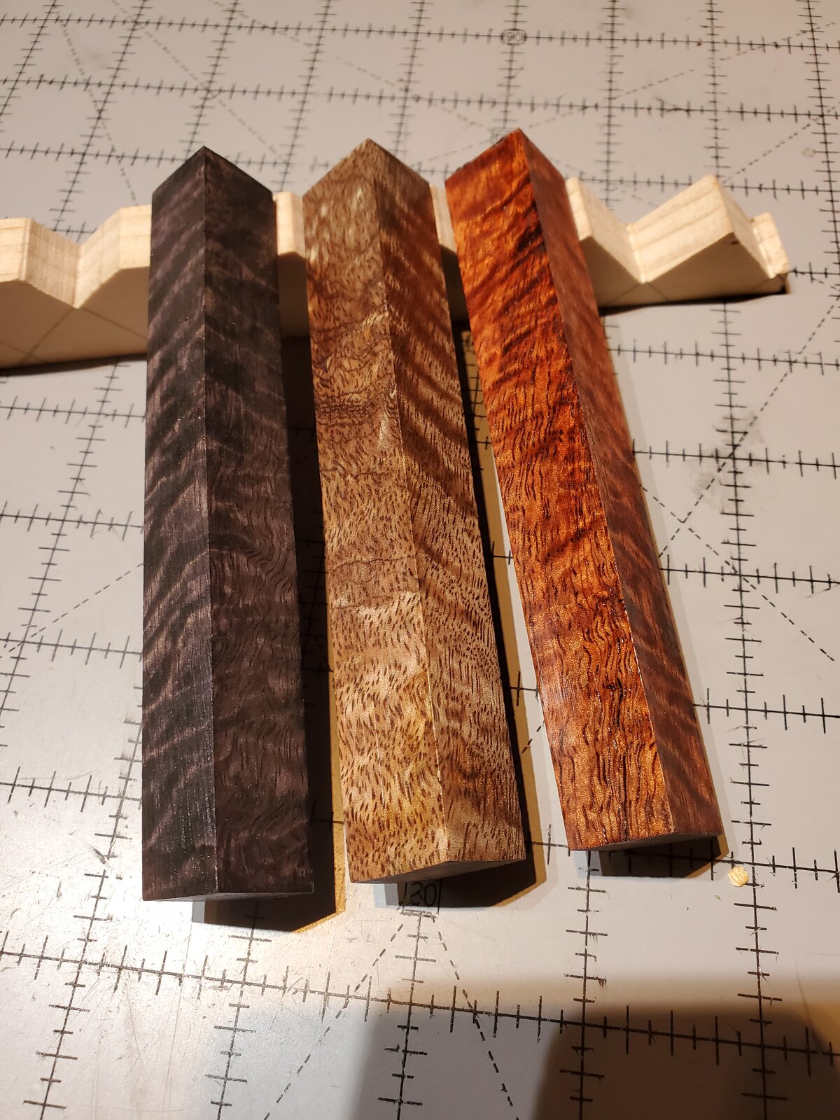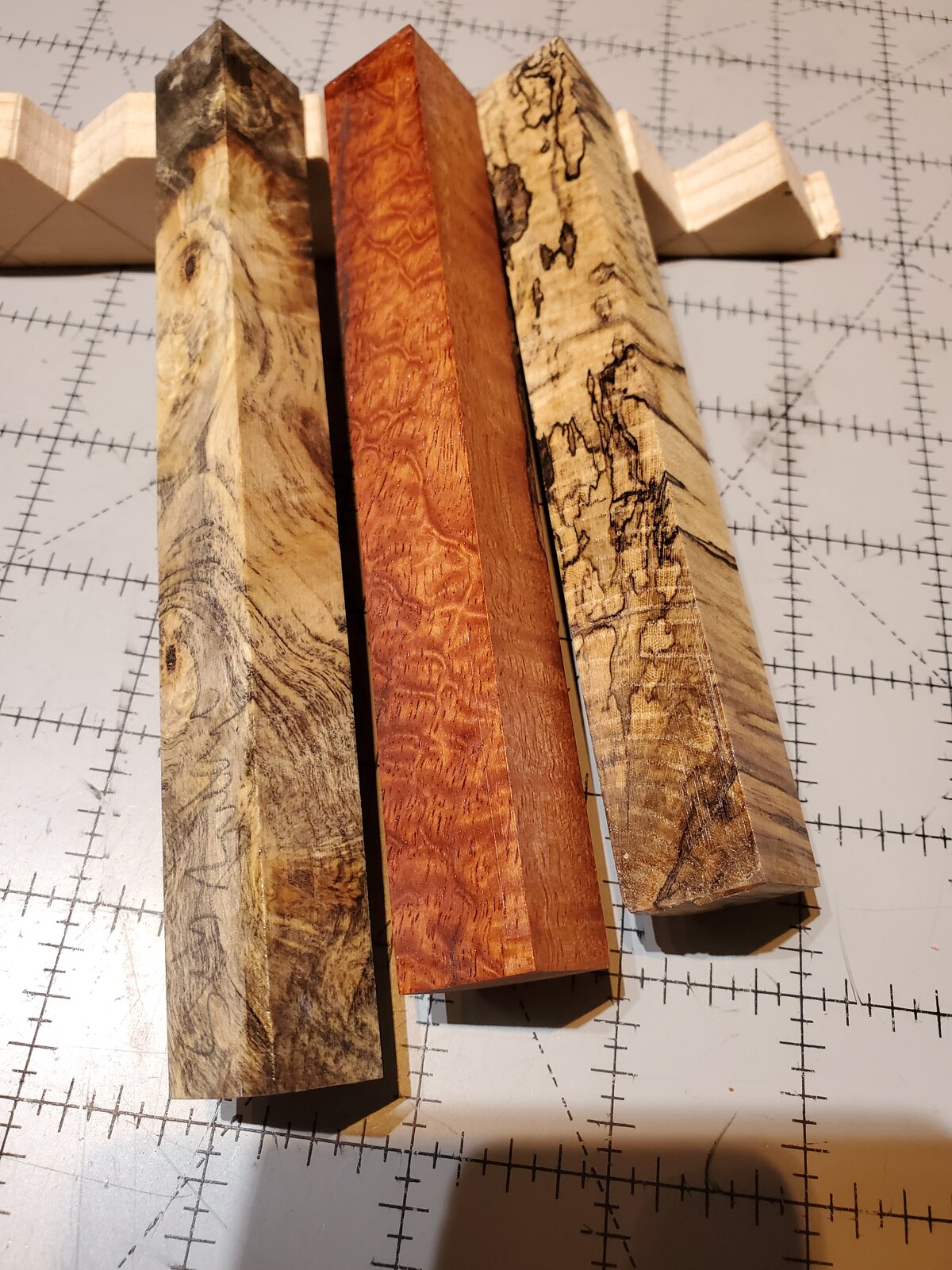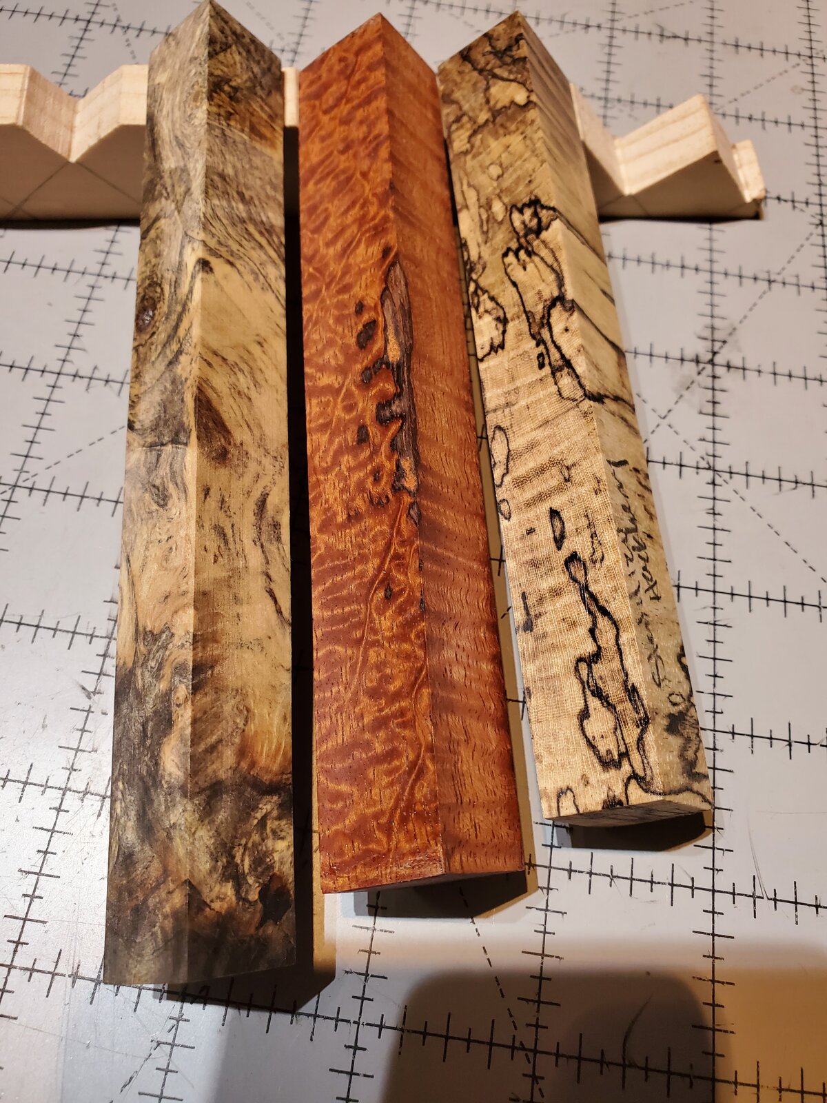 Lot 3: three long blanks - stabilized buckeye burl, stabilized crosscut spalted hackberry, afzelia xylay, $15