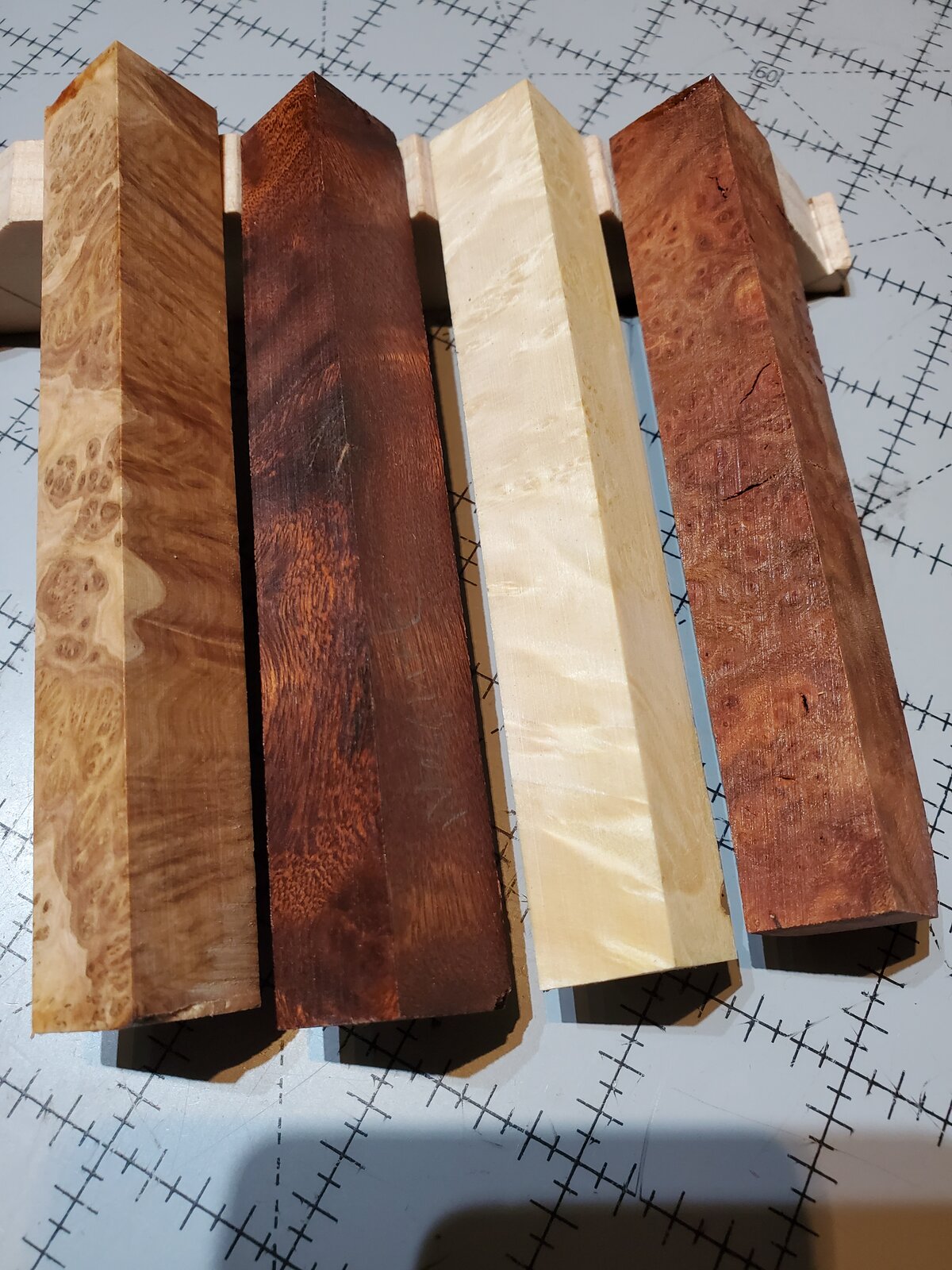 These are seven lots of wood pen blanks. Individual lot prices do not include shipping. One lot ships for five dollars (USPS regular), more for $8 total (USPS flat rate). Blanks are min 5 x 0.625" square, but normal is 0.75" and some are larger or longer. Please make a claiming post in thread to avoid confusion, and we will sort out details via pm. If you make my life easier by taking all, I will sell all for $75 shipped.