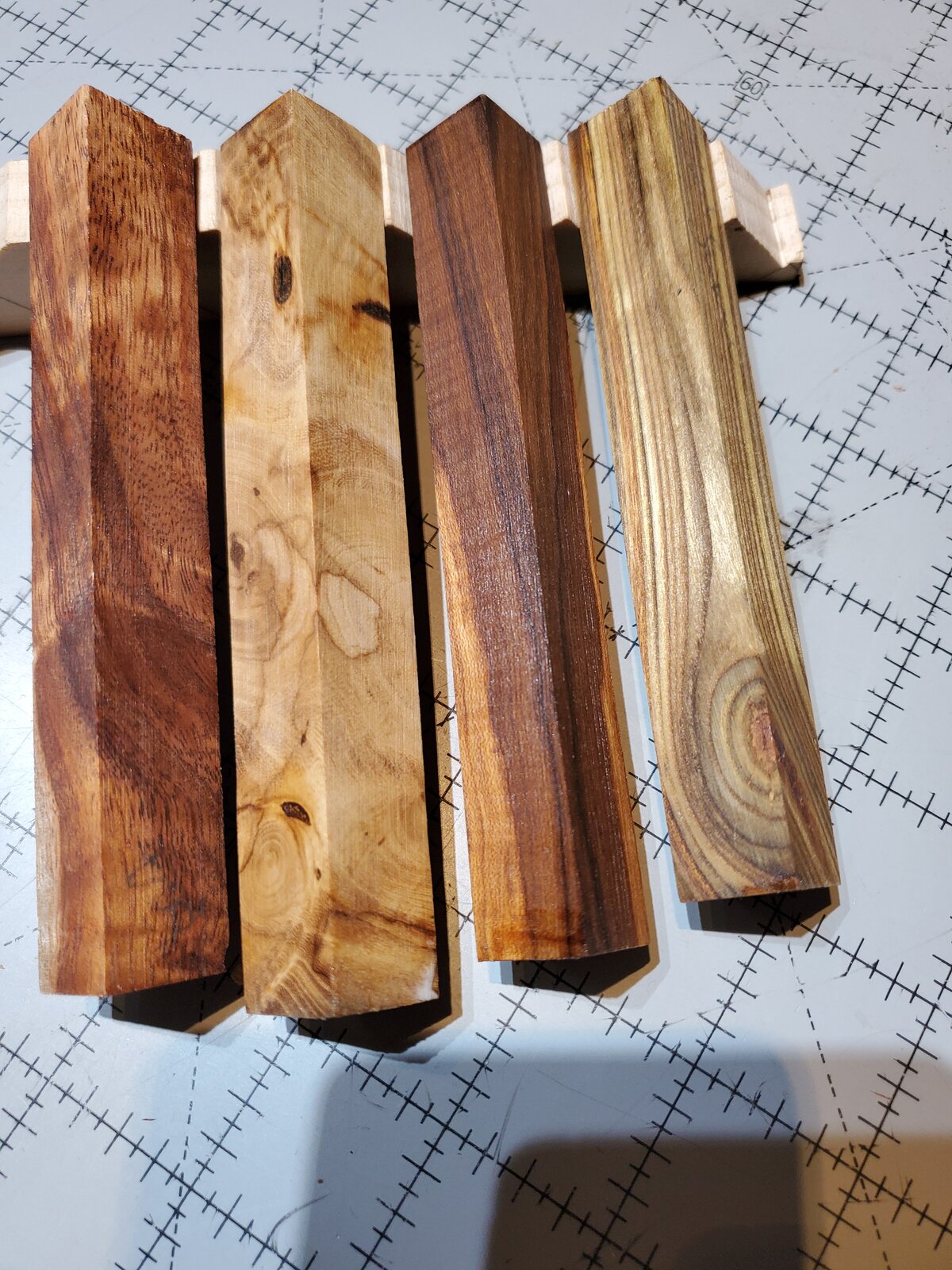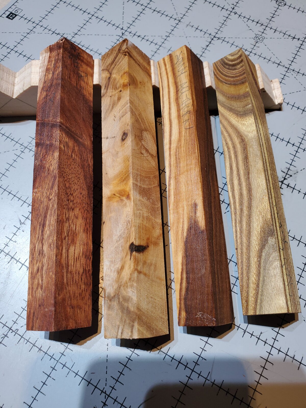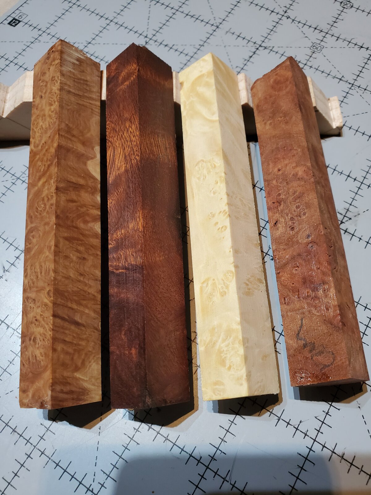 Lot 7: four oddball blanks - stabilized sumac, koa w weird curl, curly spiny allthorn, stabilized buckeye burl, $10