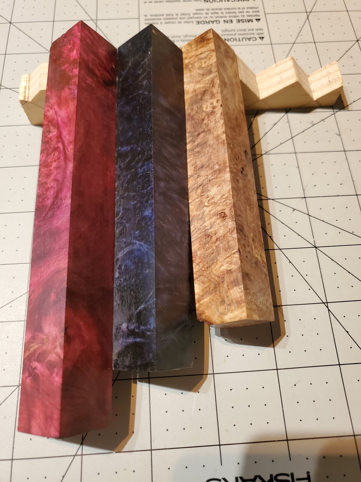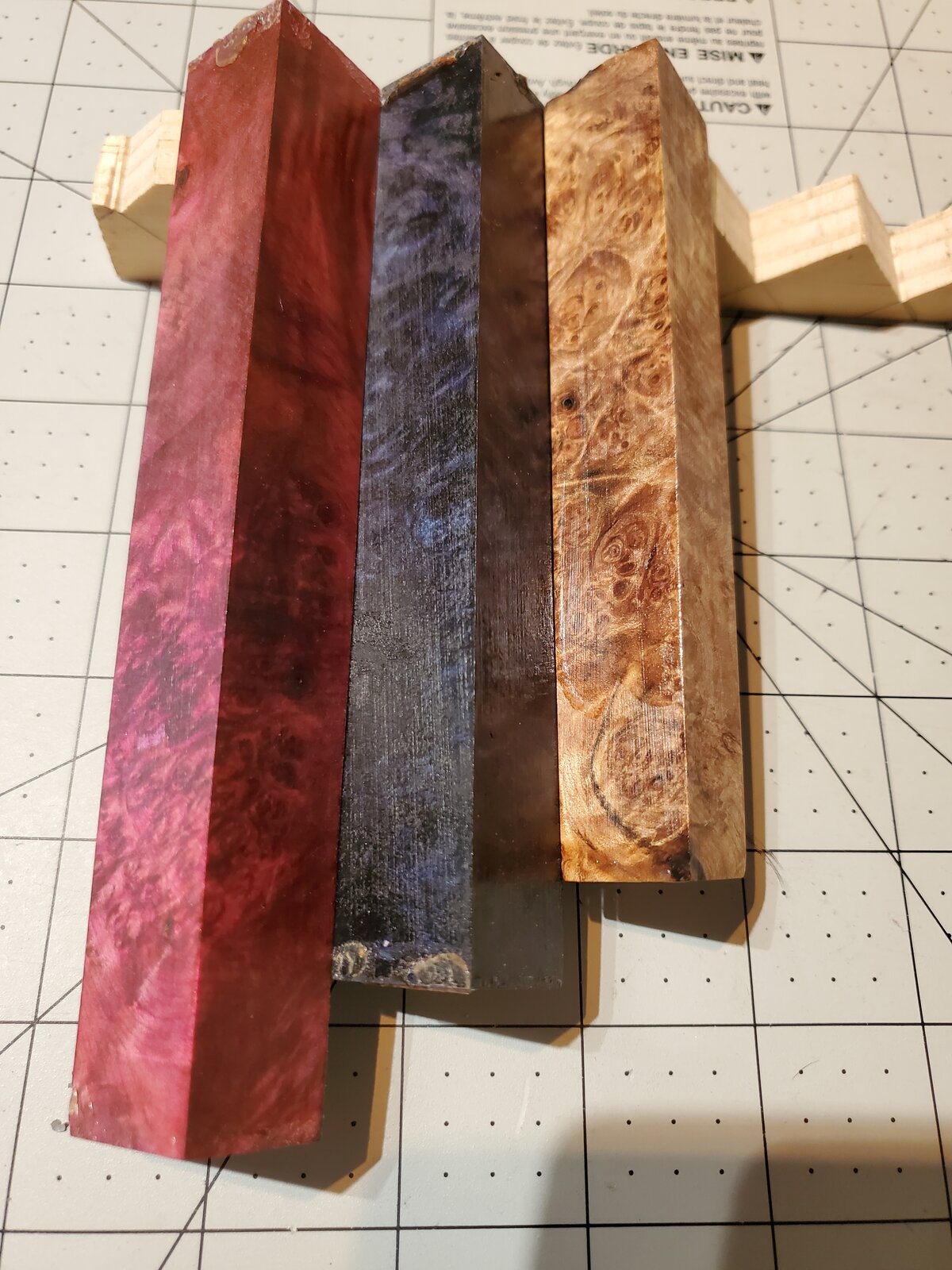 Lot 6: 3 stabilized maple burl, two dyed and one clear - $12