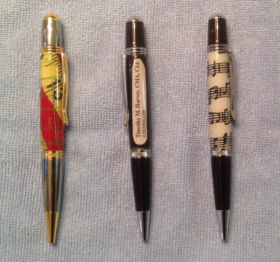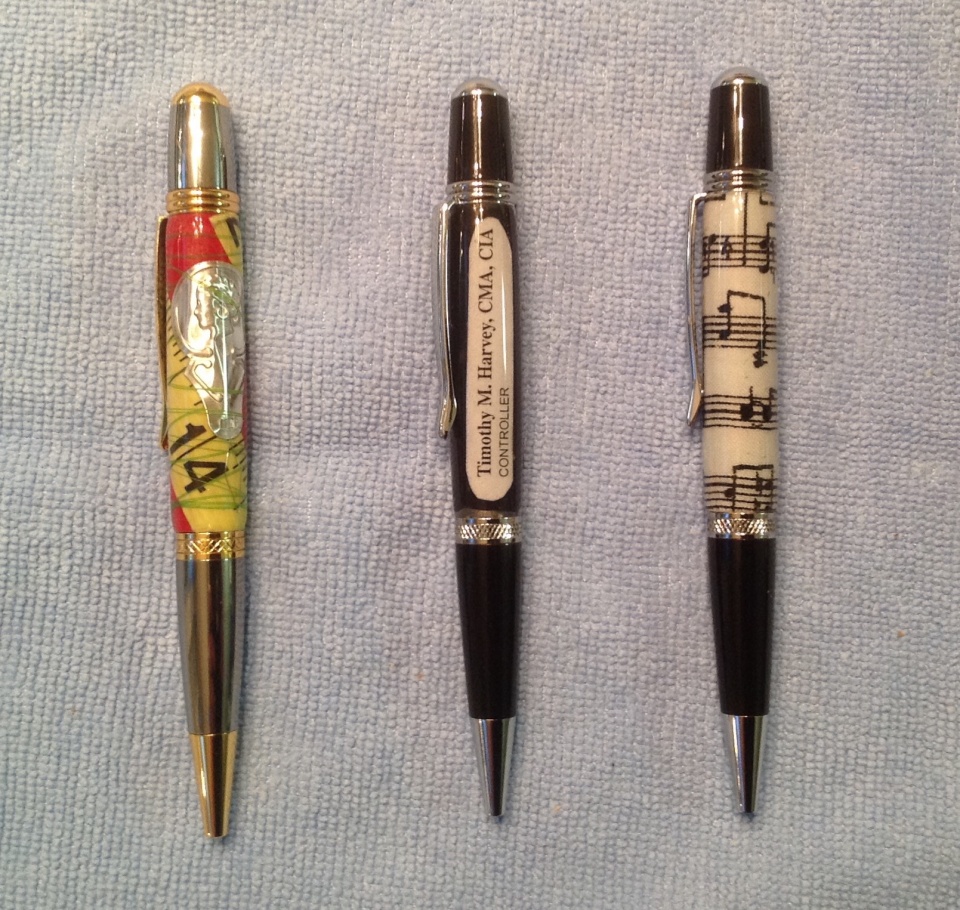 The middle pen, I painted the tube black, cut and mounted pieces of my business card to personalize the pen. The reverse side of the pen has my employer's logo, but I do not have permission to show it on websites that might have unrelated commercial interest. Mounted on a chrome Sierra. Don't think I will be selling this one. :laugh: