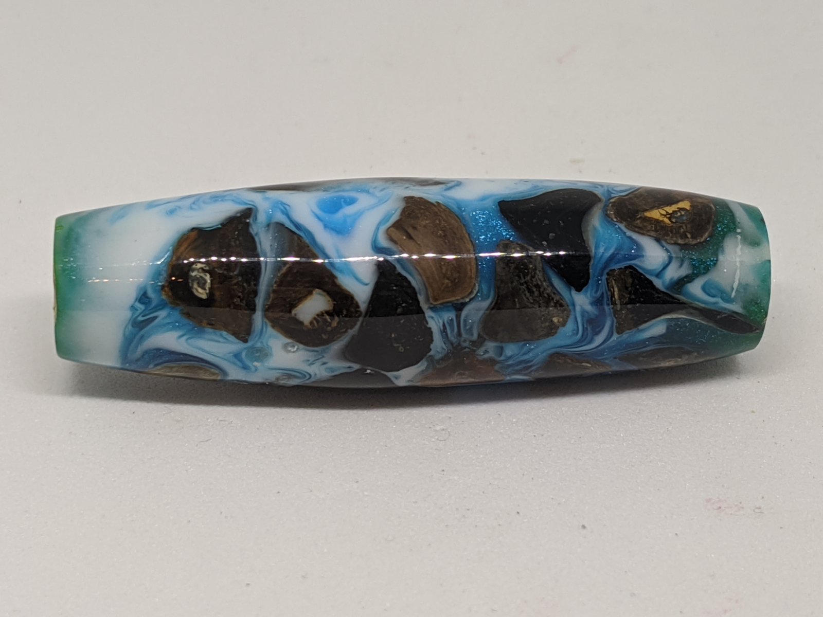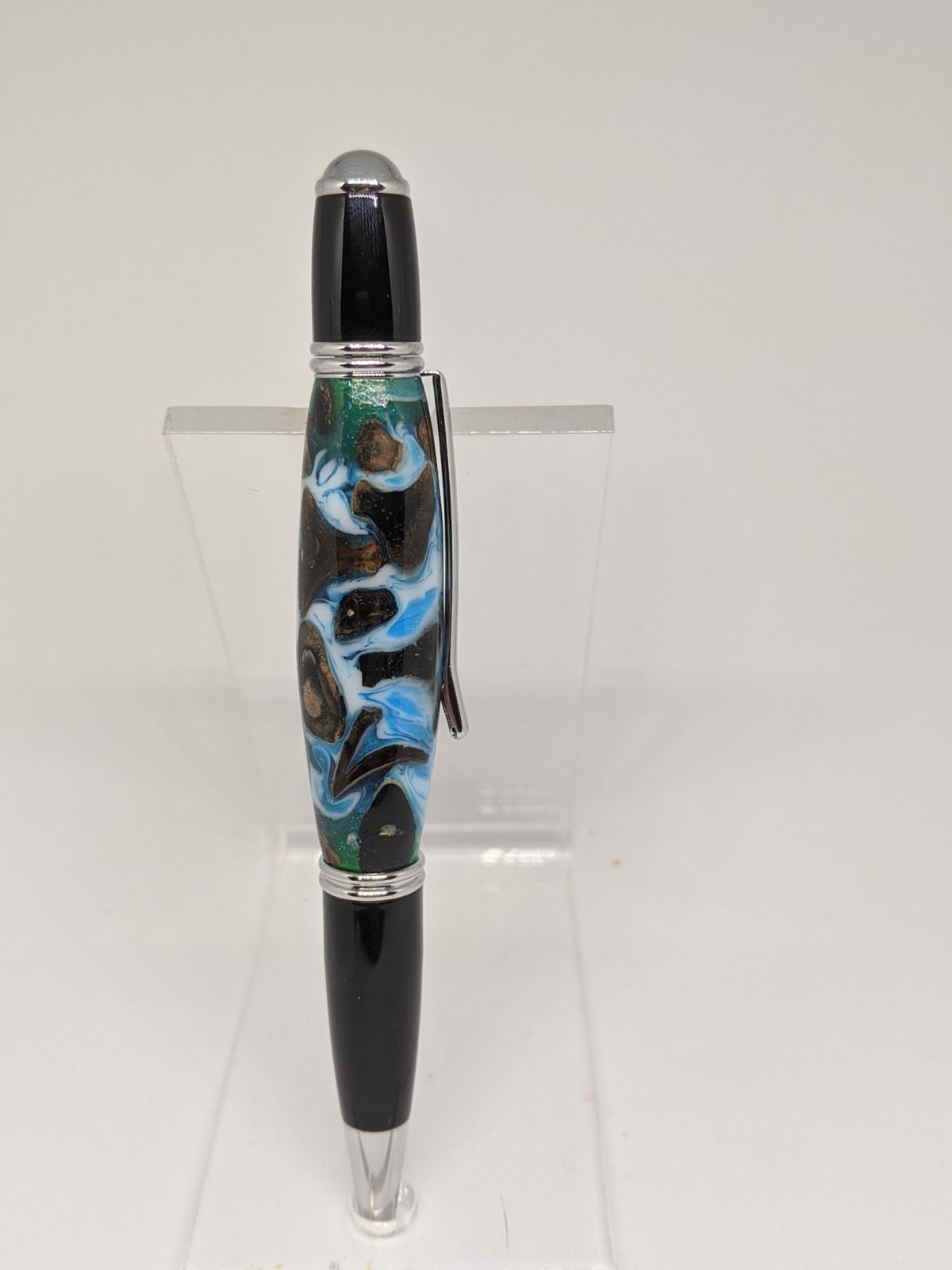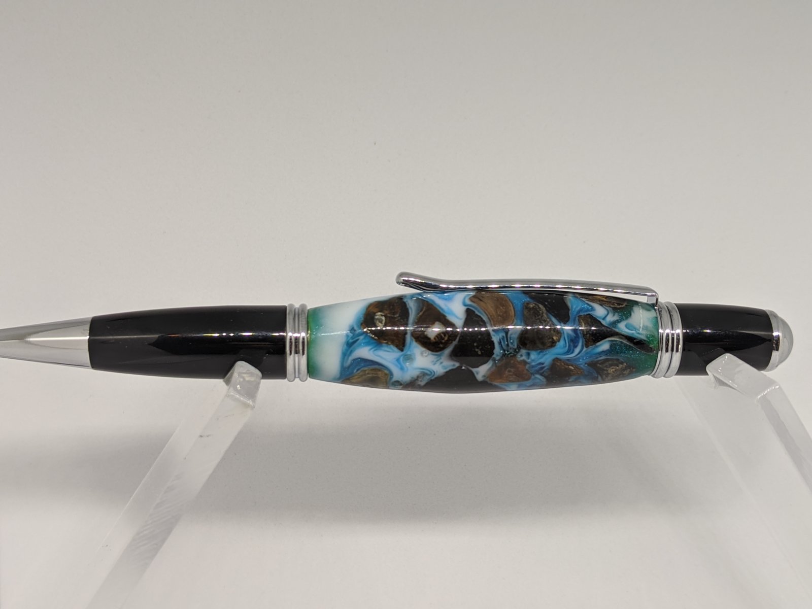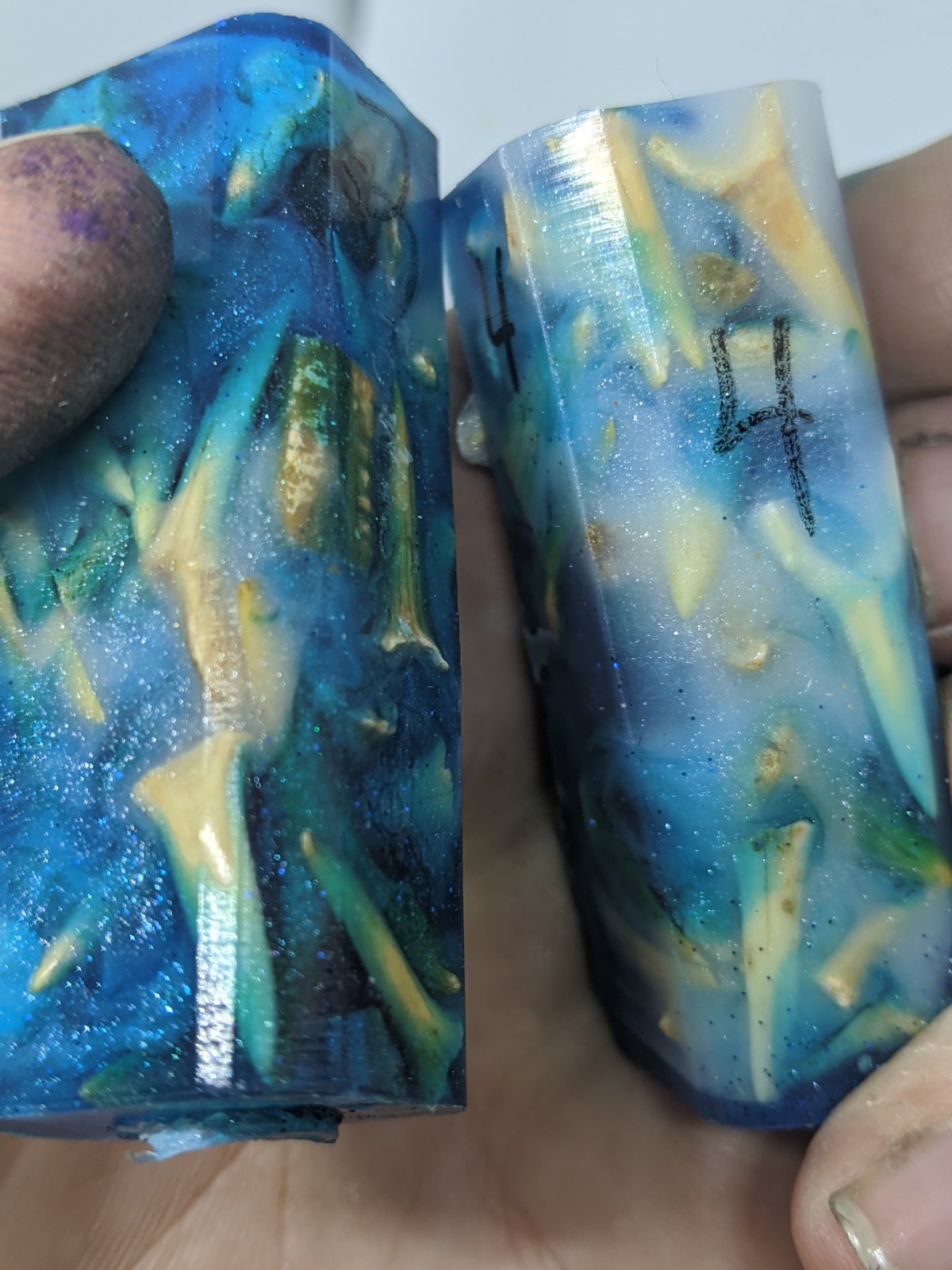 In any case, I used carbide to turn, lots of sanding, and I ended up doing a CA polish just to ensure that no teeth pop out of the body. Blue and White mica powders were used and I think I waited the right amount of time for little to no separation on the black tooth pen and not quite enough time on the white tooth blanks...as those don't have quite the same defined difference between the blue and white resin colors.