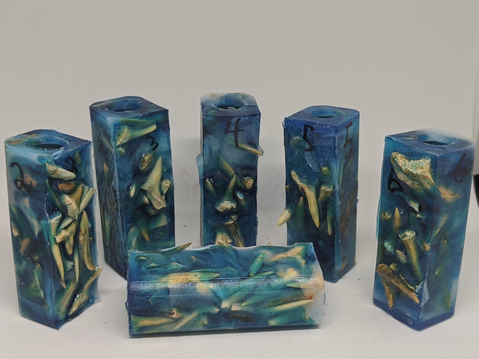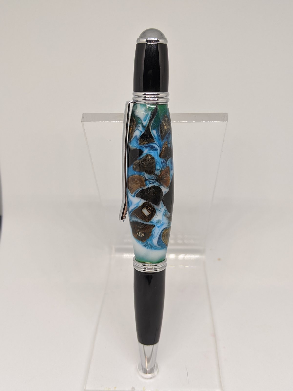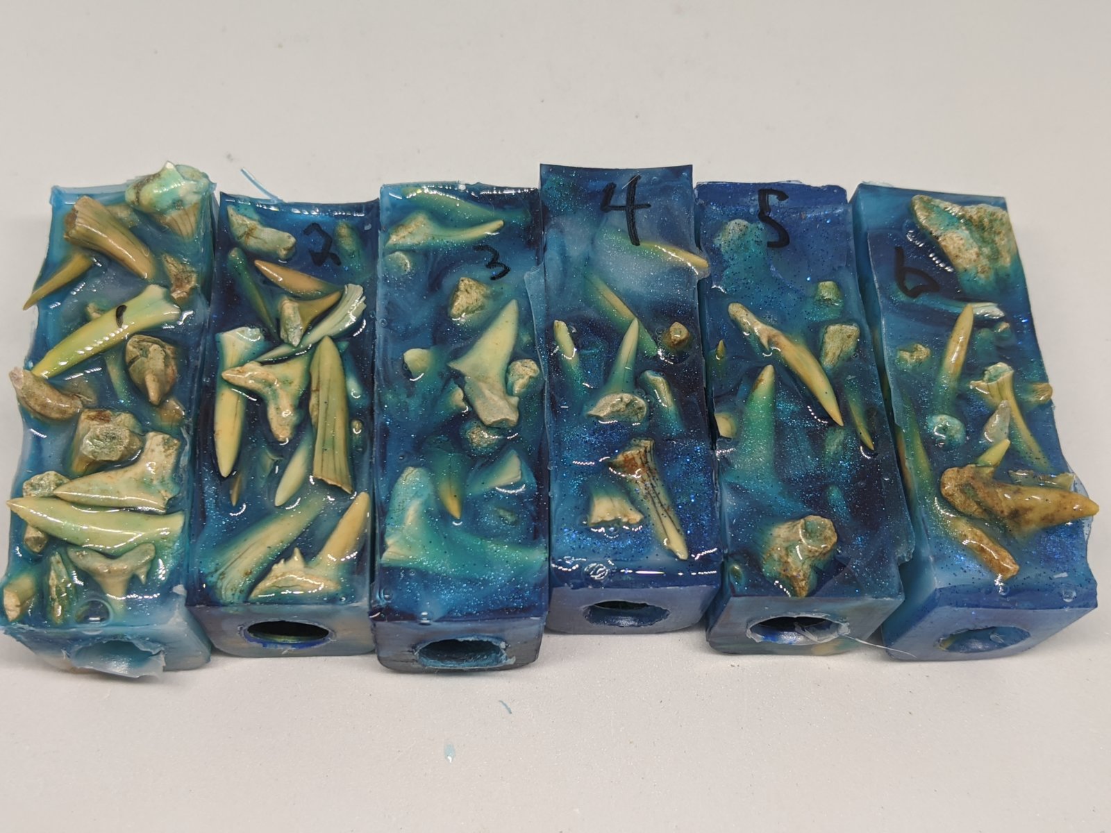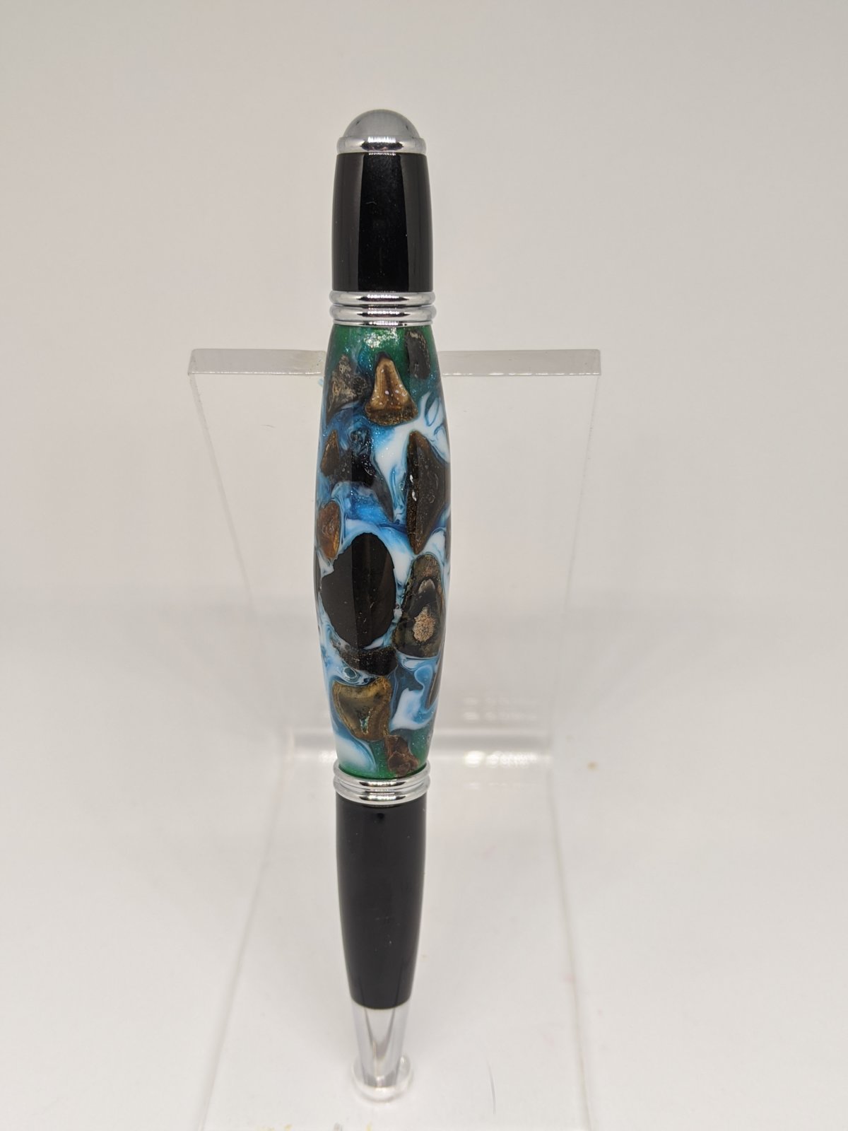 I had a lot of fun with this one. I bought some shark teeth from a supplier in FL and then resin cast them in a Sierra tube mold from ptownsubbie. The pen featured uses black teeth from 5 to 20 million years ago.