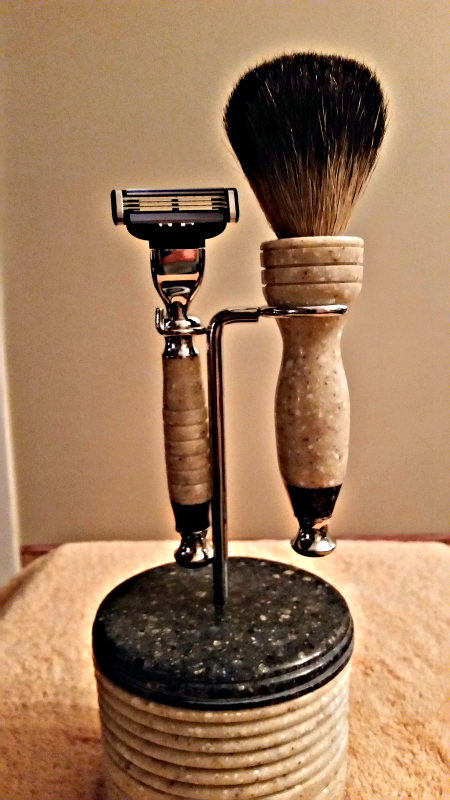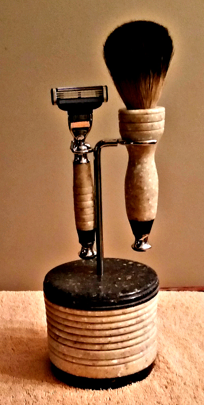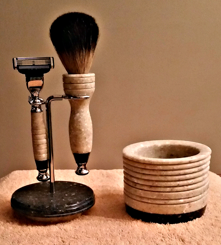 This is a shaving mug, razor, brush, & stand. All made from Corian.