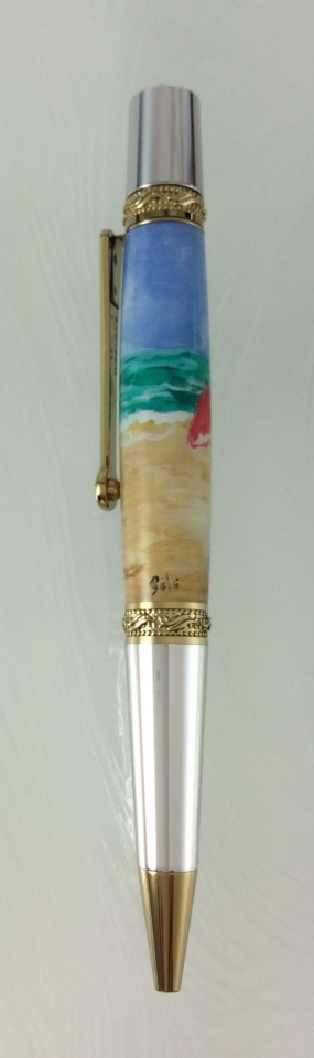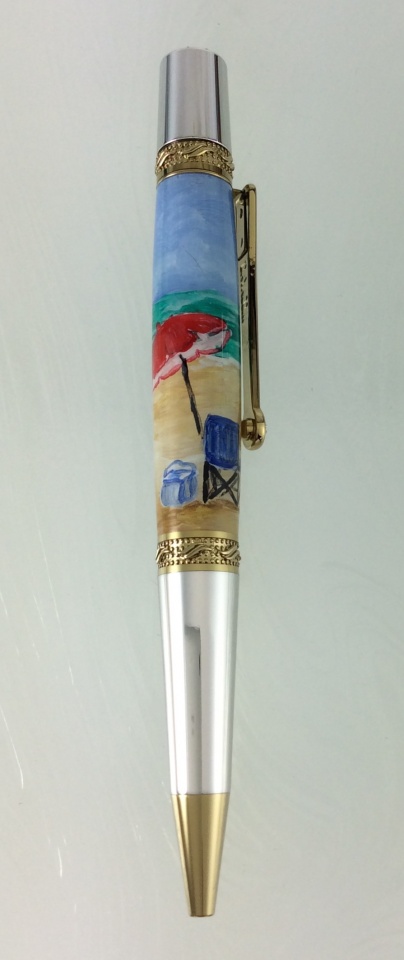 The pen blank is a Patty Sole hand painted/cast beach scene which I turned yesterday. We paired it with a Le Roi Major in Gold Titanium/Rhodium (from Smitty).