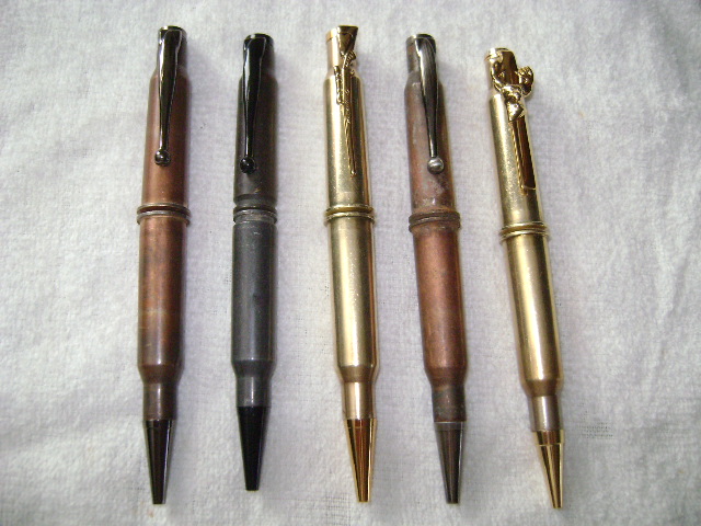 .....Picked up these old shell cases yesterday and here are 5 pens I made today. These are 762 X 54 cases of steel and brass. The second from the left is made from military .308 s. Be well.....Jan