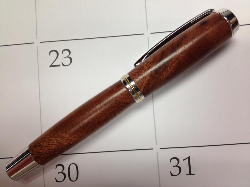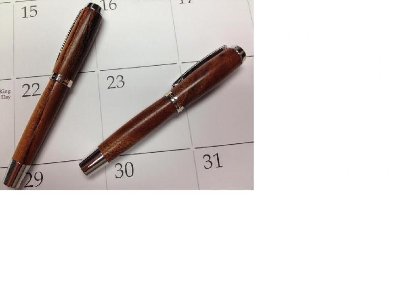 I finished up two Jr. Gent II pens. They are rhodium and 24k Ti gold, one is african red wood and the other is cuban mahogony crotch wood. Both have 6 coats of thin CA finish buffed out on a Beall system.