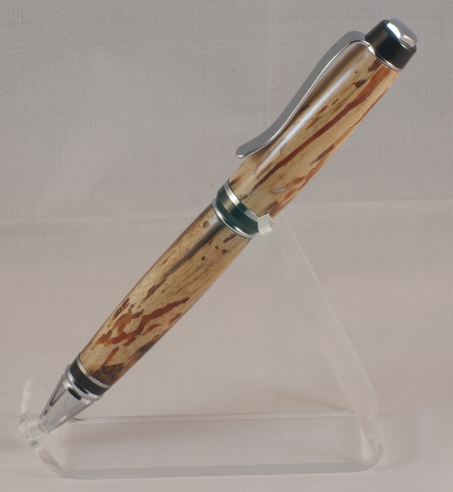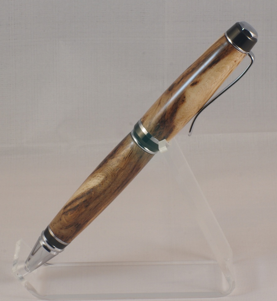 It turned out looking so nice that I have made it my carry pen, even though it is not sellable. The tip had a section break off which I filled with sawdust and the under the clip a rather large section broke off and the crack lines can bee seen even though I was able to glue the piece back in place.