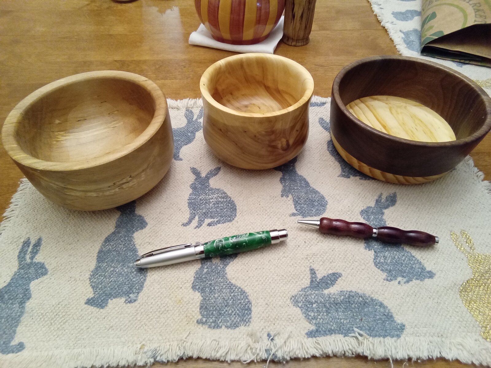 Had to work yesterday and didn't get home til 4 pm and had to do some shopping this morning, but still cranked out a few goodies last night and today. Left is a fogwood bowl with some nice spalting, middle is elm, and right is walnut and pine. The pens are an inlace acrylic Presimo rollerball and a purpleheart slimline.
