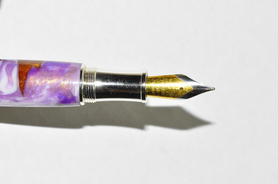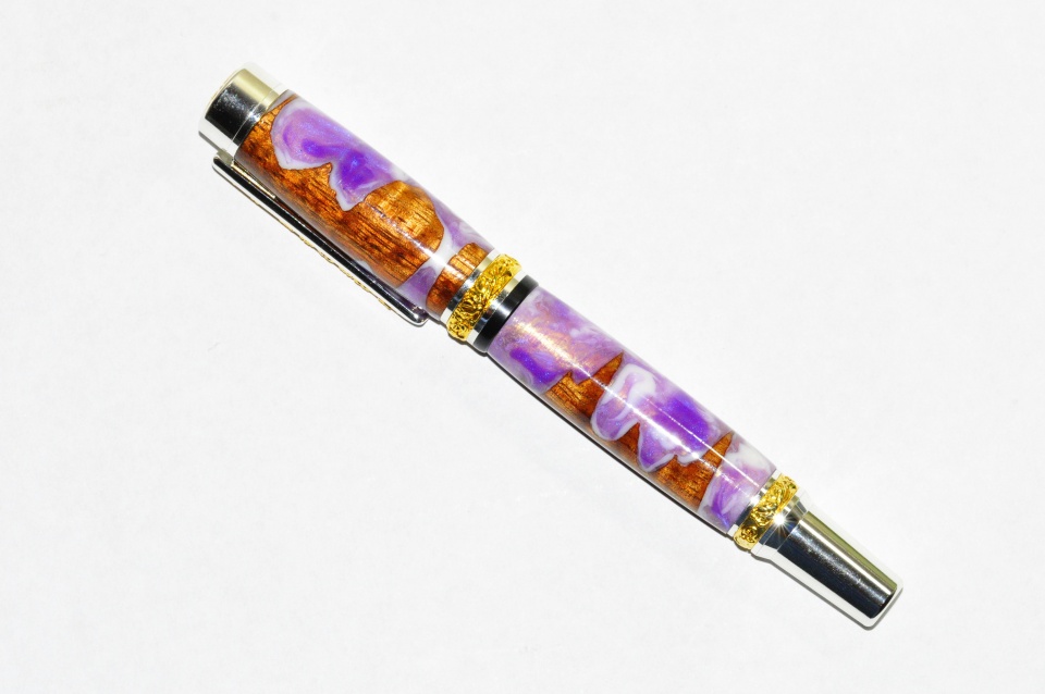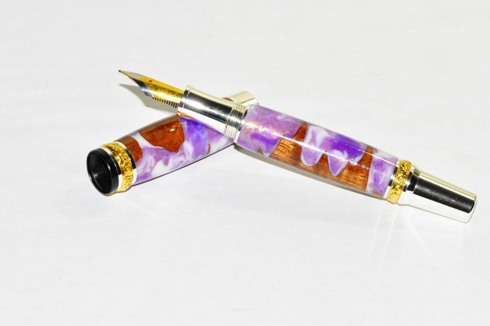 This is a blank I got on e-bay called "LAVA FLOW WOOD & ACRYLIC FUSION". After turning I realized the blank should have been reversed painted. That was my second mistake with this blank The first was drilling the base wrong when my wife came into the shop, This Cambridge was suppose to be a Navigator for a customer and cost me $85 for a new set of blanks from Hawaii to fix my mistake. At least the customer was happy and now I have made my first fountain pen. Maybe Iwill be able to sell it some day.