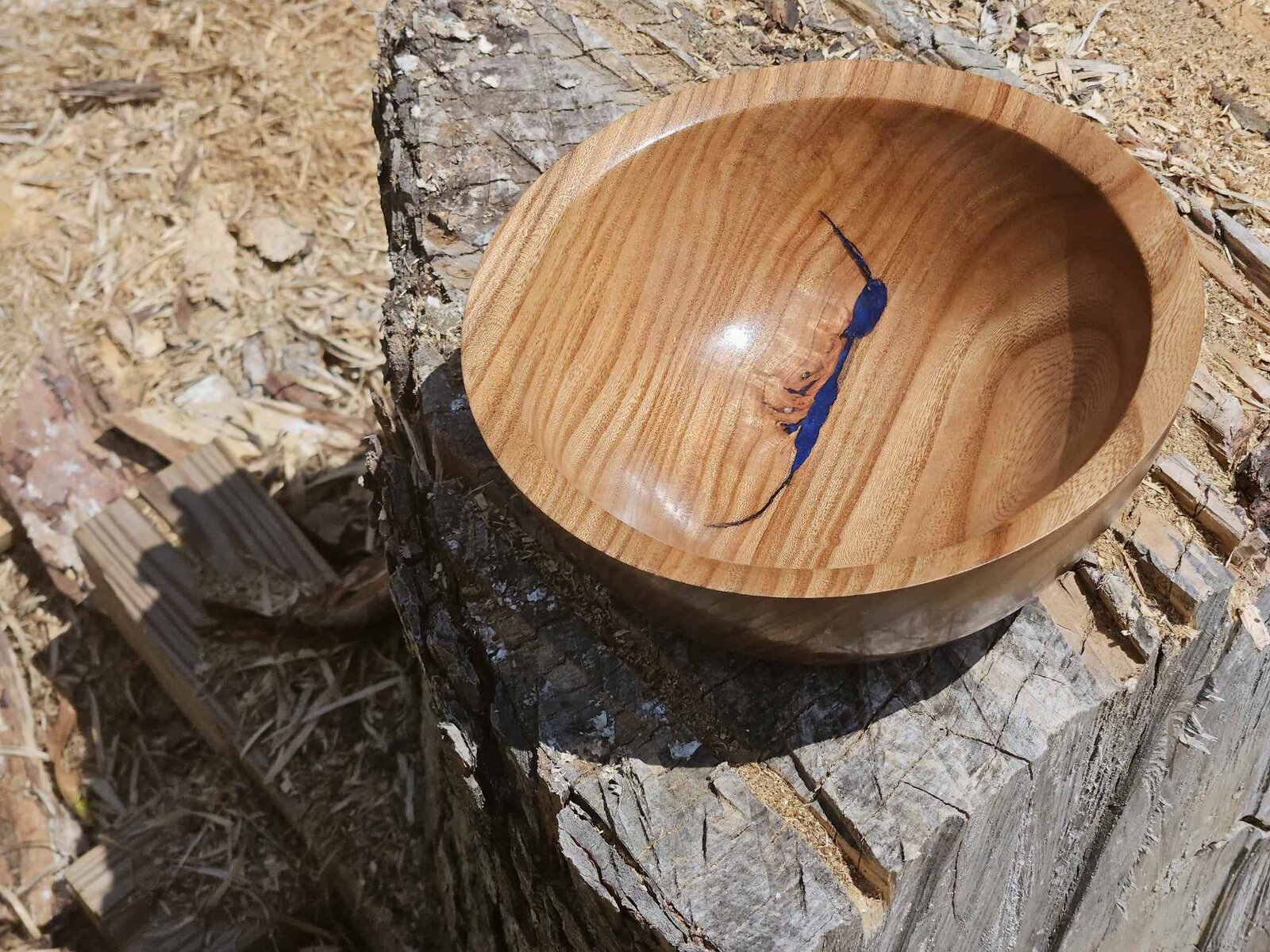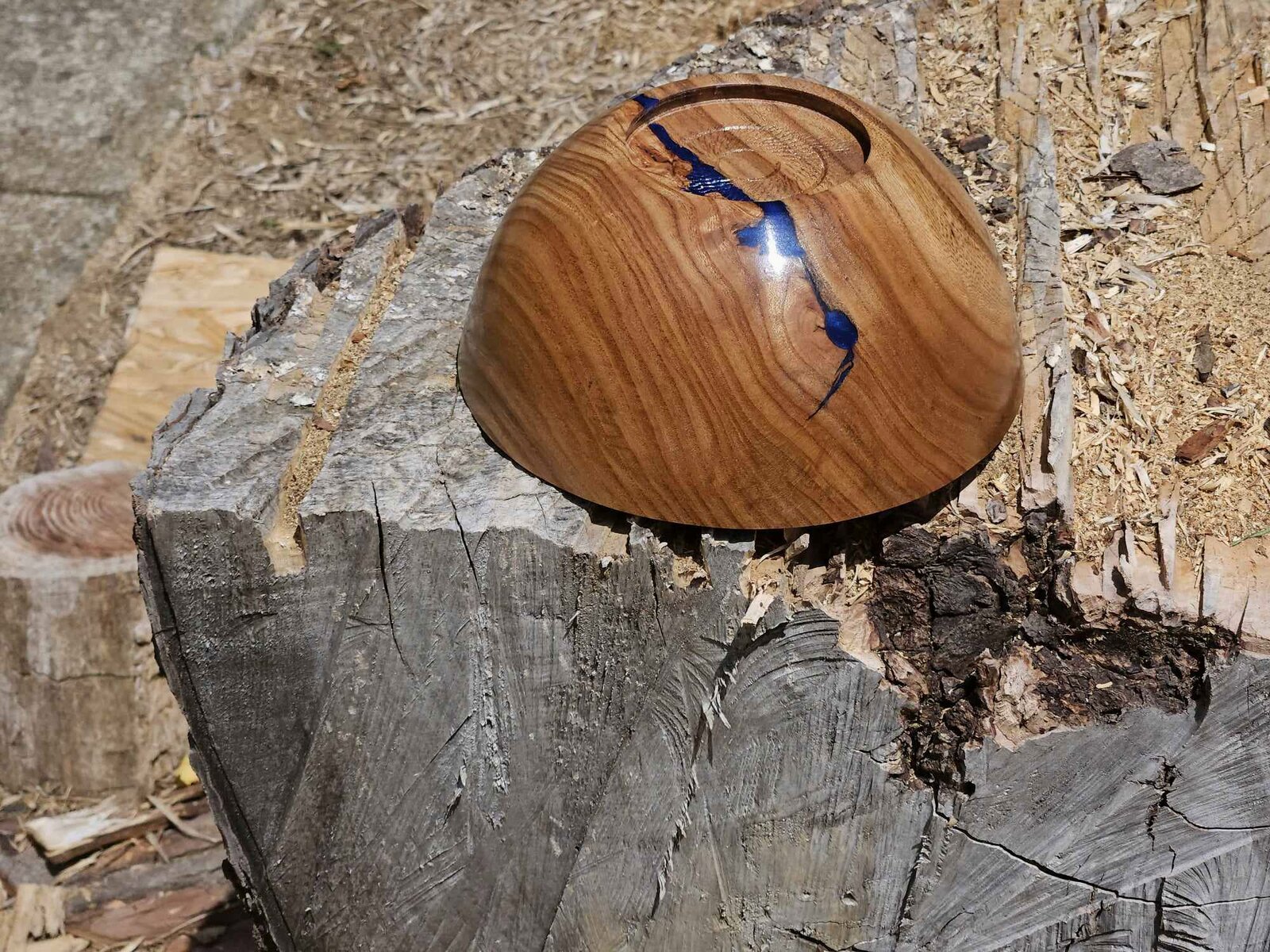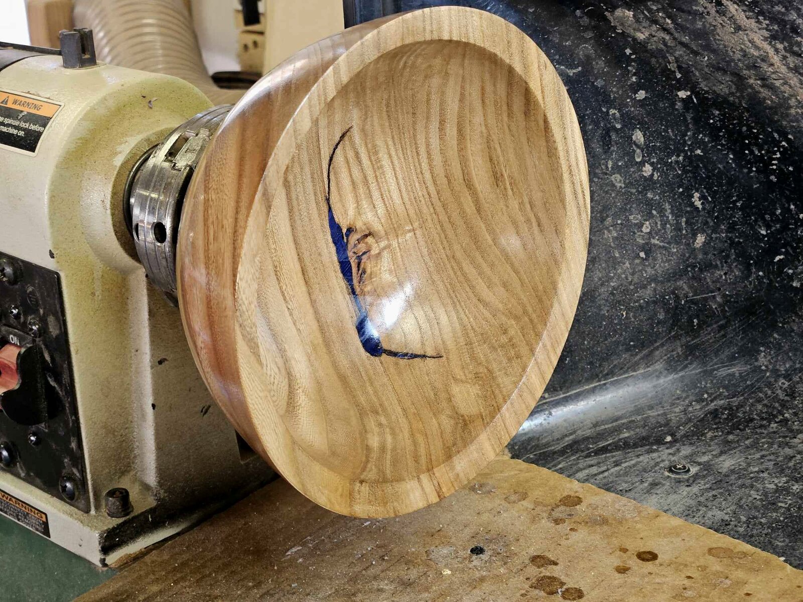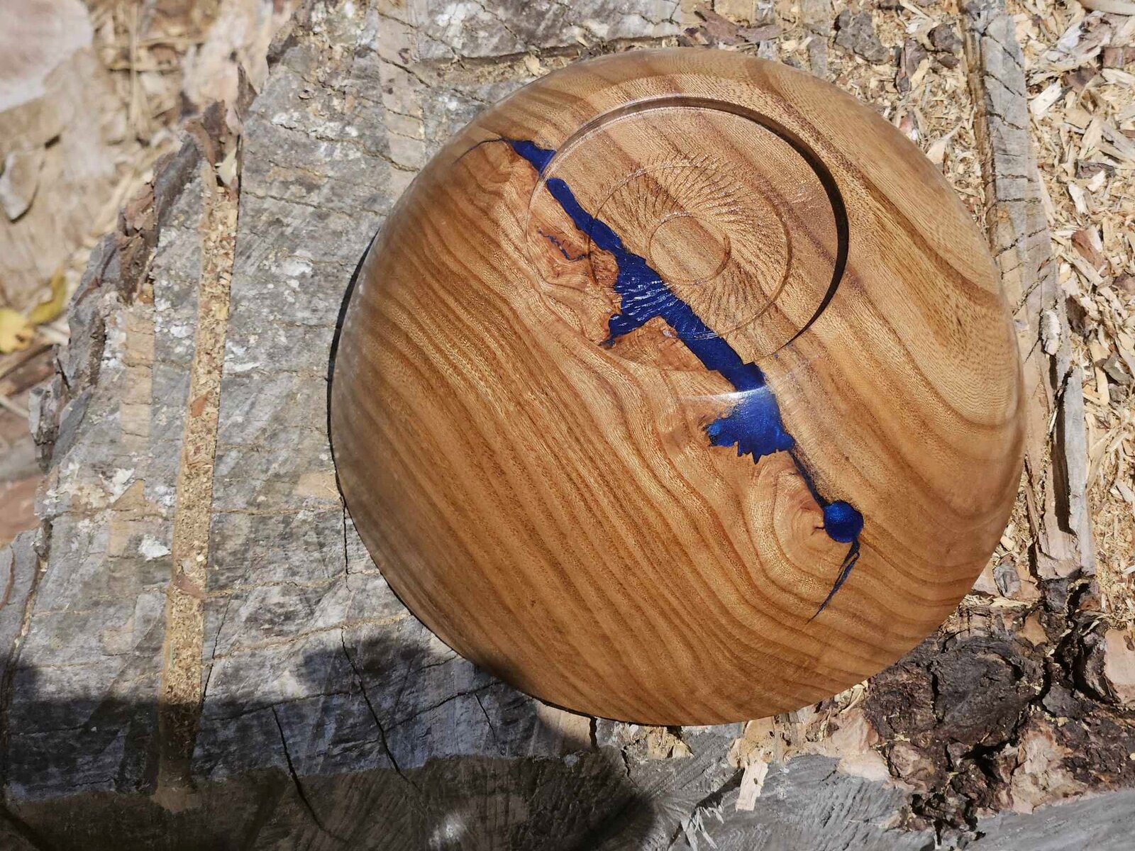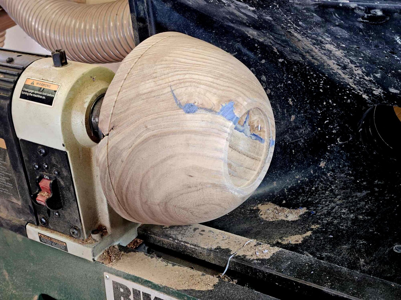 As I was turning a bark inclusion became evident right down the middle where I needed to put the mortise. So I carved out all the bark and did a resin pour. My wife said to go with the Ocean Blue powder.