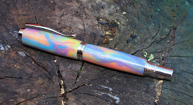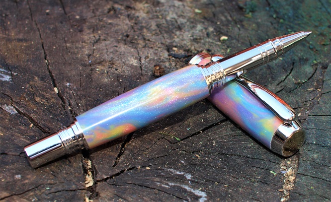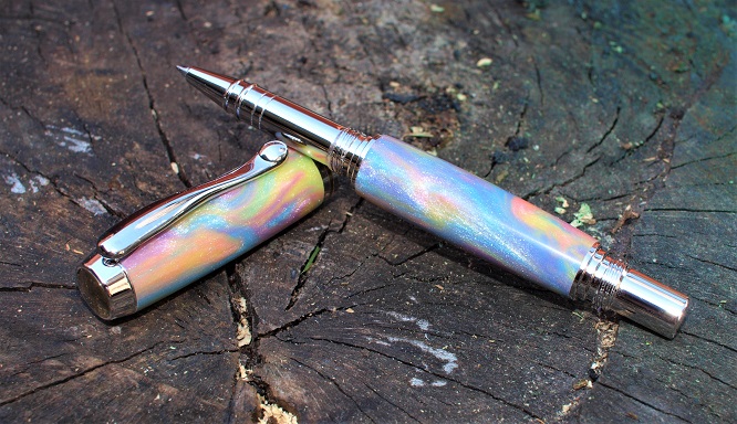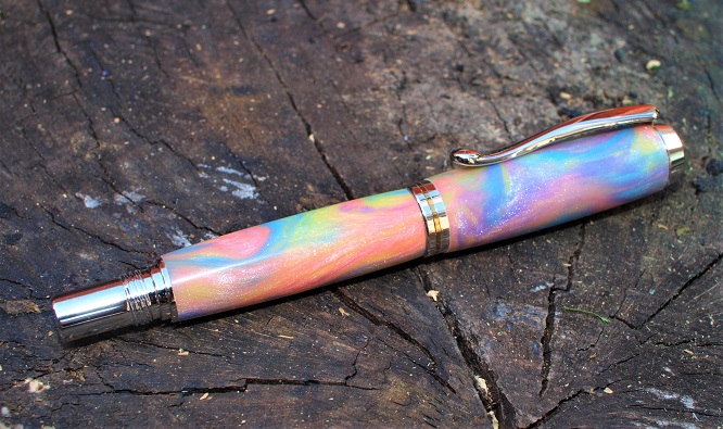 A Sigma Dual Rollerball pen made using a colourful Rainbow coloured Diamondcast acrylic called "Unicorn Nuggett".