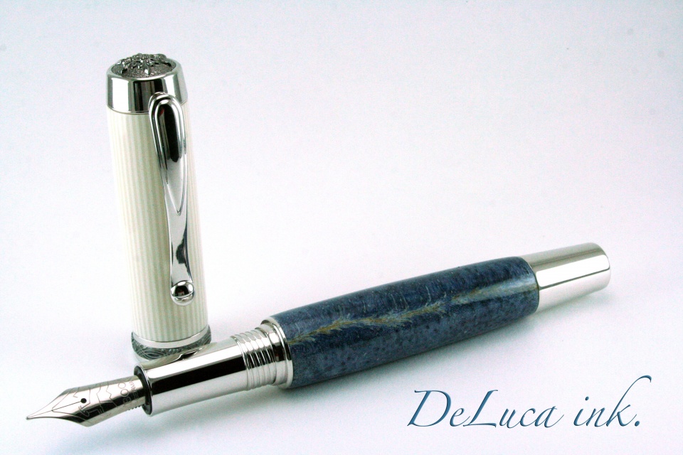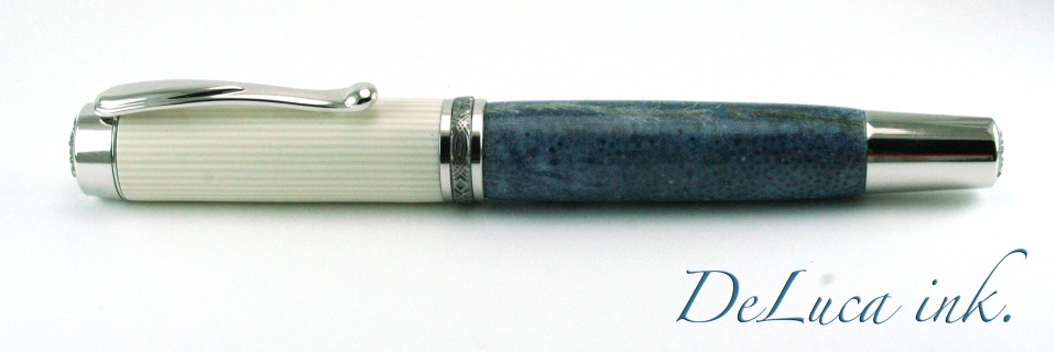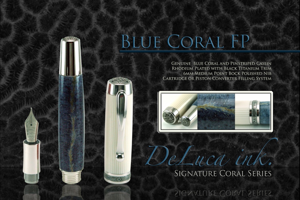 Third from the Month, and by far the most challenging. Blue Coral is basically like turning house dust, trying to keep it together. As in I have turned beautiful pieces of blue coral into piles of trash, so this is some sort of achievement for me. Full Sized Rho/Black Ti Statesman, 6mm Polished Bock Nib. Solid Blue coral body, solid casein cap, not getting crazy segmenting this piece, it stands all by itself. Before applying ca glue for the finish, the material looked like the lunar surface, full of pits, and holes, not from my turning, but just the natural porous nature of blue coral. I did my best to show the material, but its an in person thing for sure. I hope you guys like these of the series, and I will do what i can to make a few more. !! C&C Welcome..