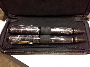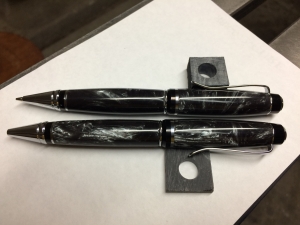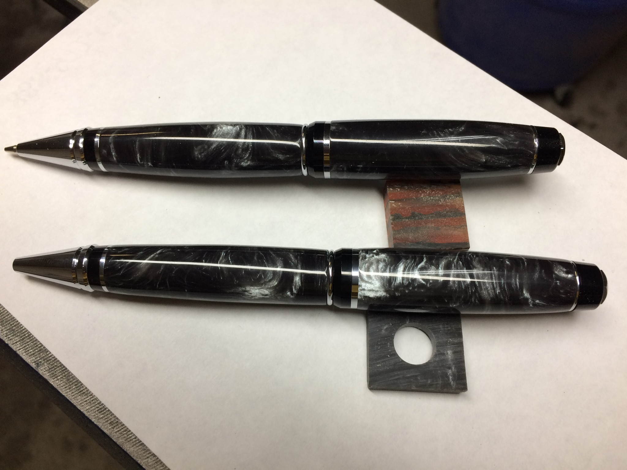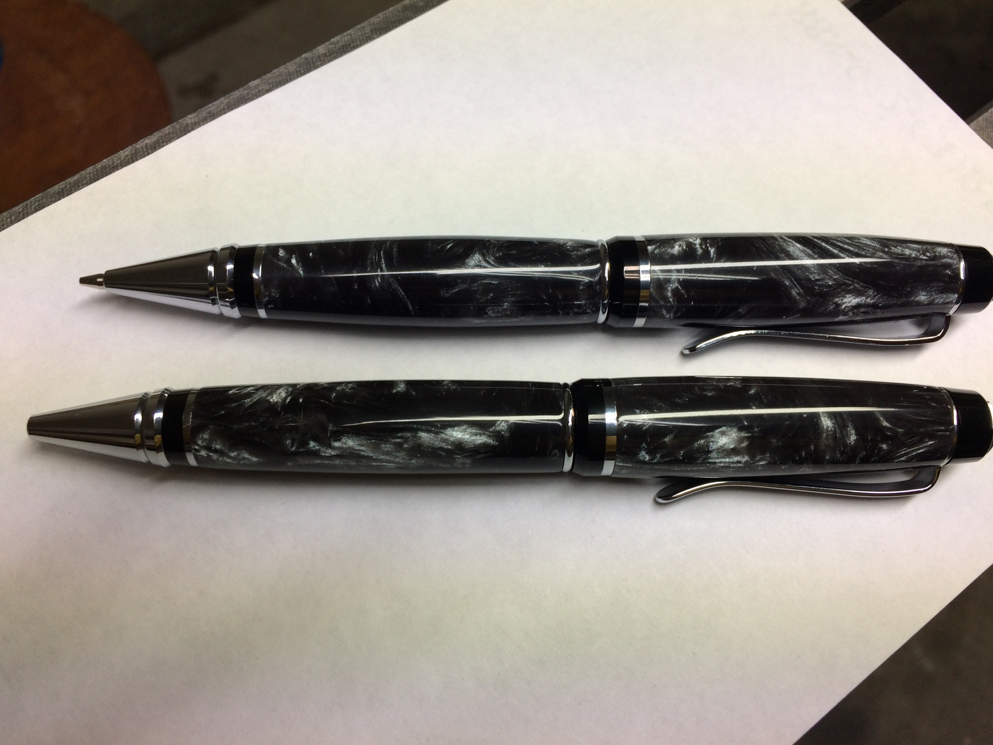 I made a bunch of slimlines for the nurses at our clinic for Nurse's Appreciation Day earlier this year. They were nice but nothing to brag about. Imagine my surprise when one of them, whom I've worked with for about 9 years, asked if I would make a pen & pencil set for her to give to her father for Christmas. She asked for them to be larger diameter and to be black with some silver. Now I won't even pretend to be at the level where I should be selling pens, so I agreed to do it at cost with the condition that if she wasn't satisfied she wouldn't have to pay for the kits. The blanks are silver mono swirl from BTW. I don't know what the resin is but they don't have the depth of shine I get from my own PR or inlace acrylester but I'm still happy with them. I cast my own with the last of my silver mica and didn't wait long enough to mix so I ended up with an almost homogeneous color and had to buy these. Overall I'm happy with them, and hope she will be too. C/C always welcome, except when it comes to my low quality phone pics! Thanks for looking.