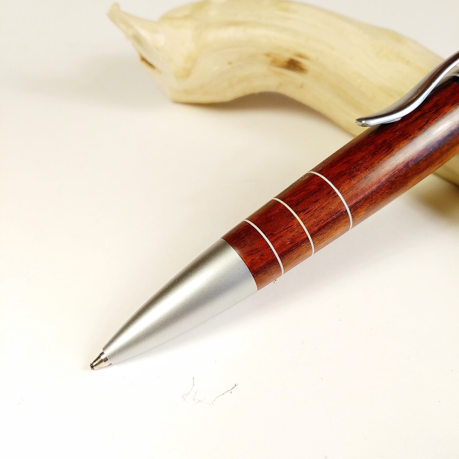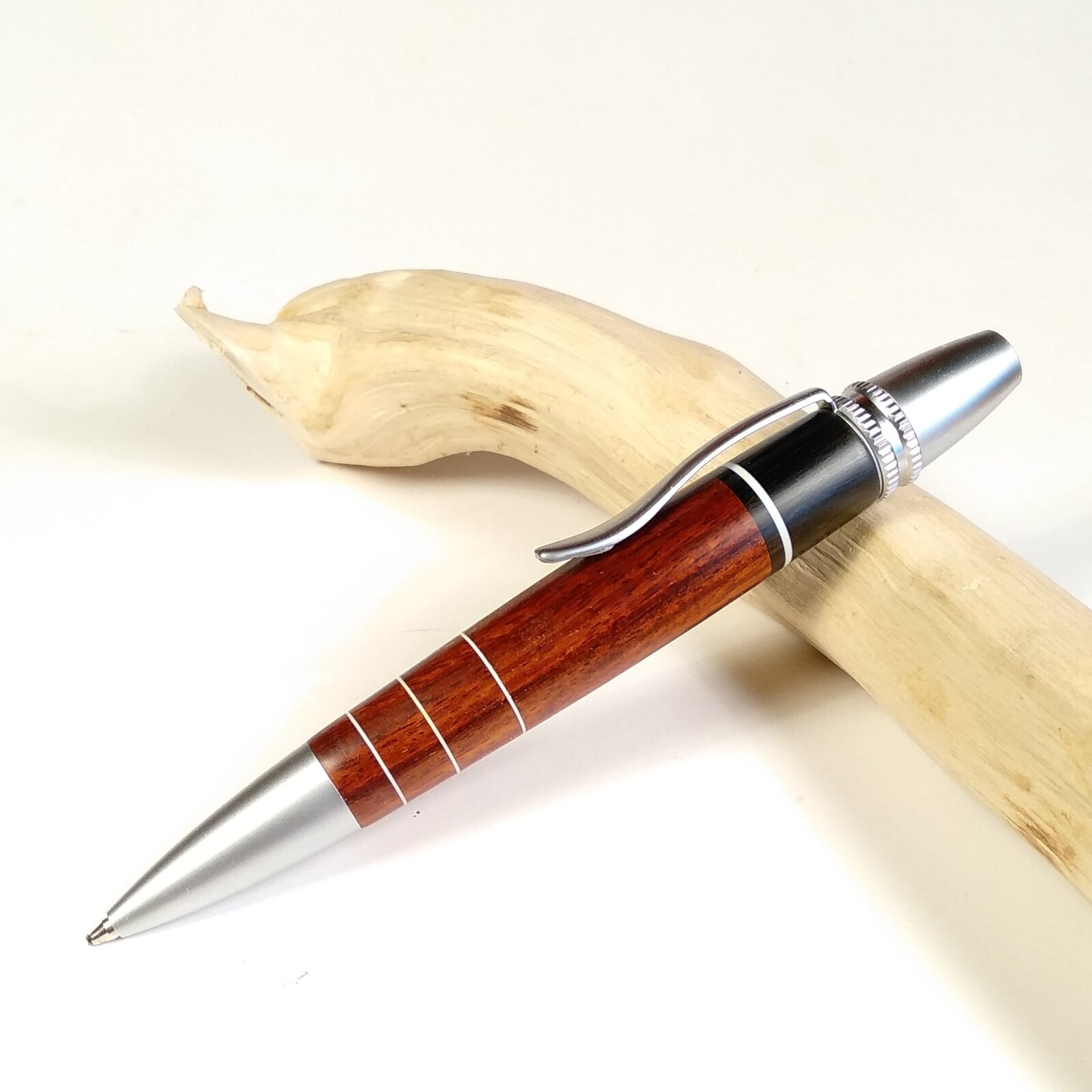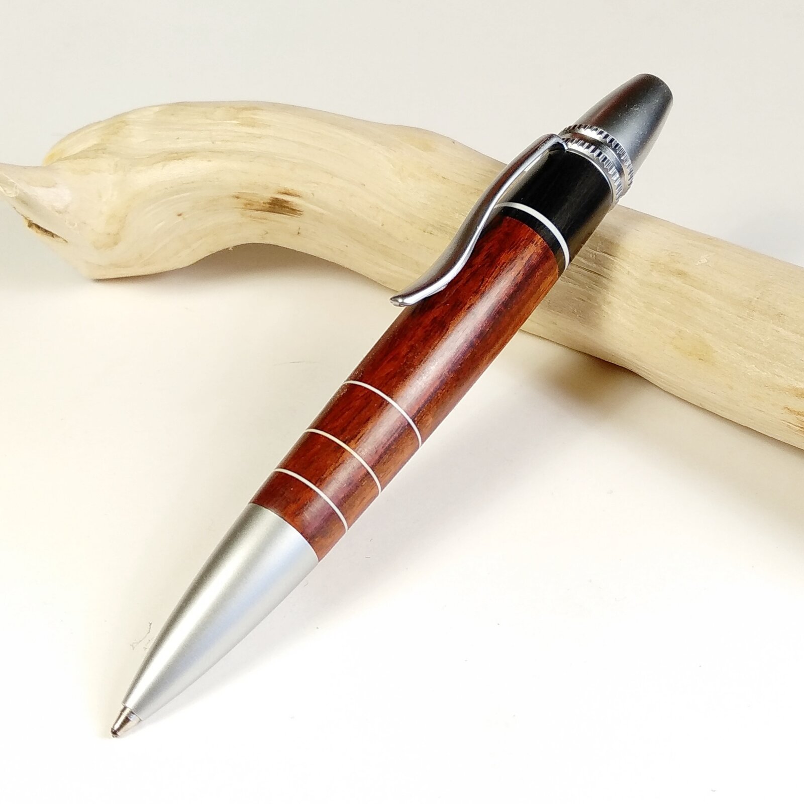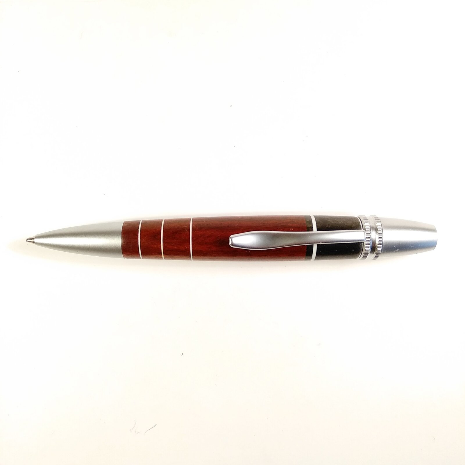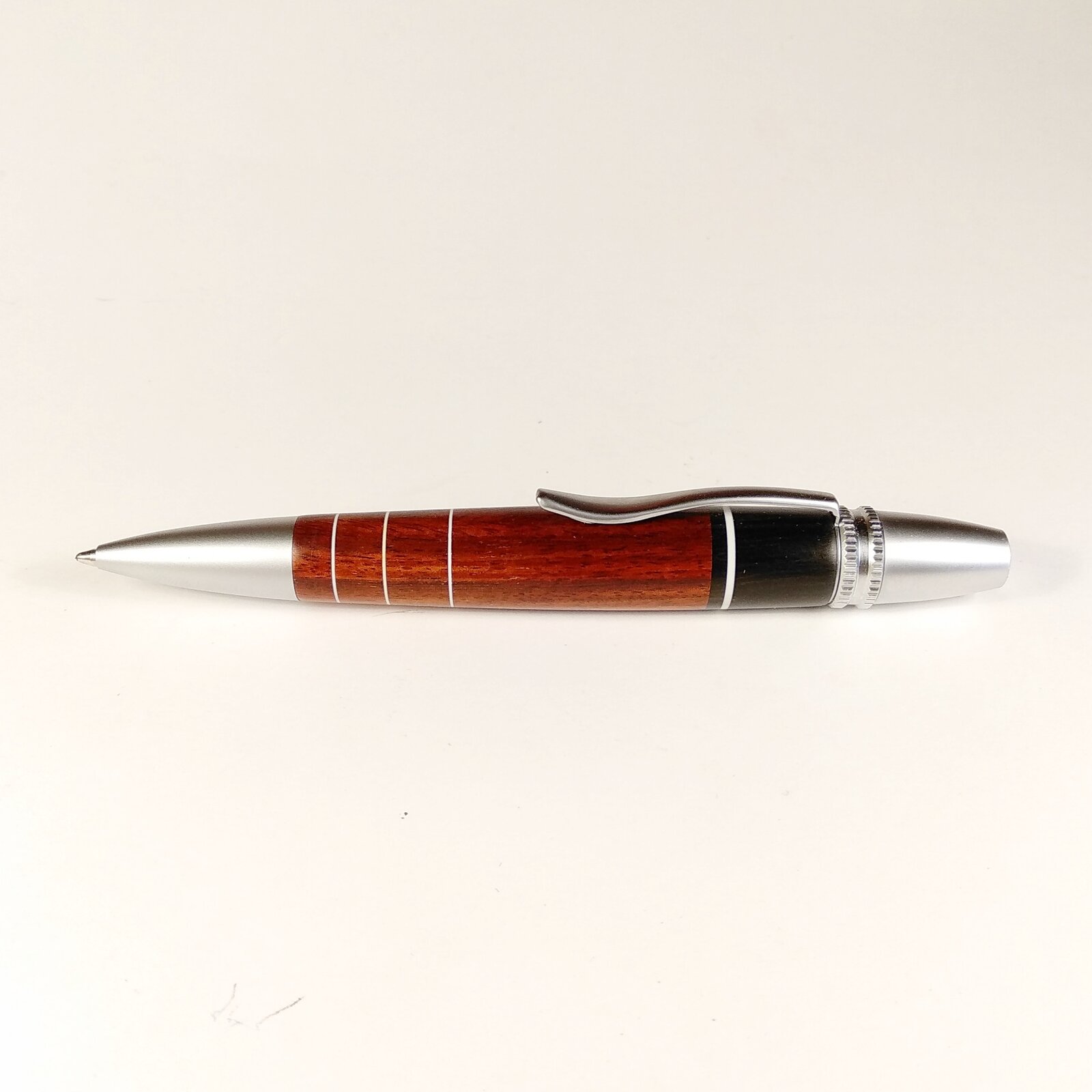 I'd like to share my latest pen: made of swartzia and ebony wood with white styrene ring accents.