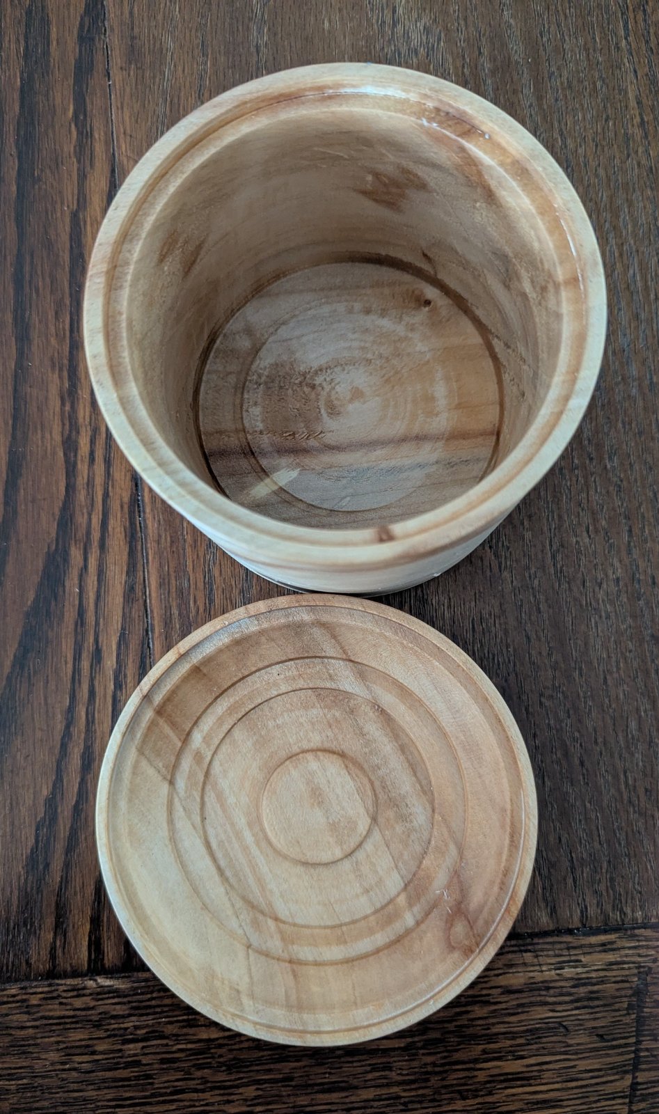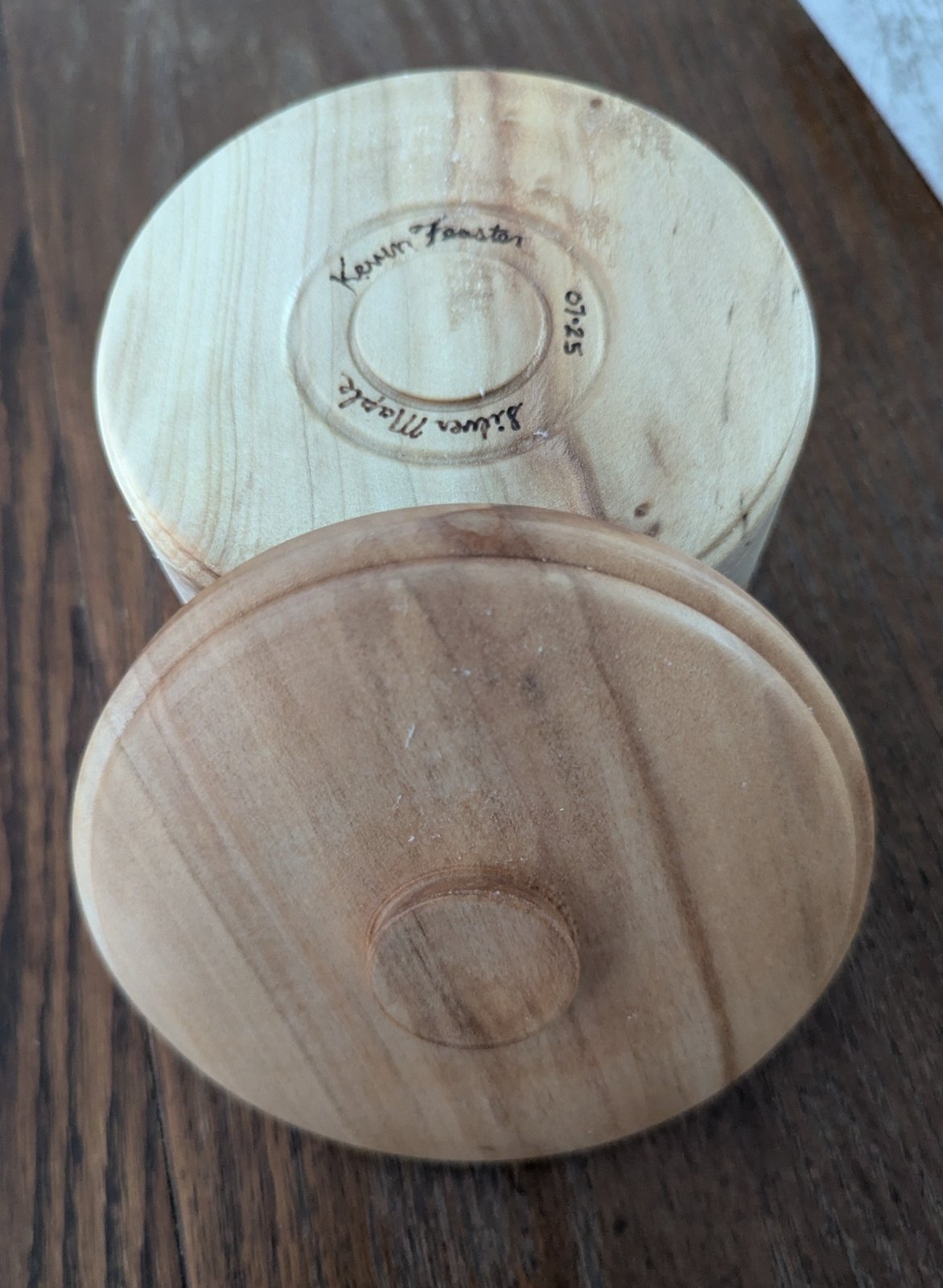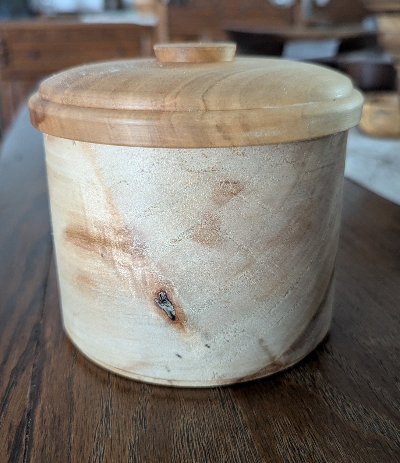 Used some cutoff pieces (that is why they don't match) and turned a simple box. 4/5"Ø x 4.5" tall Finished with a combination of Beeswax and T&T Original.