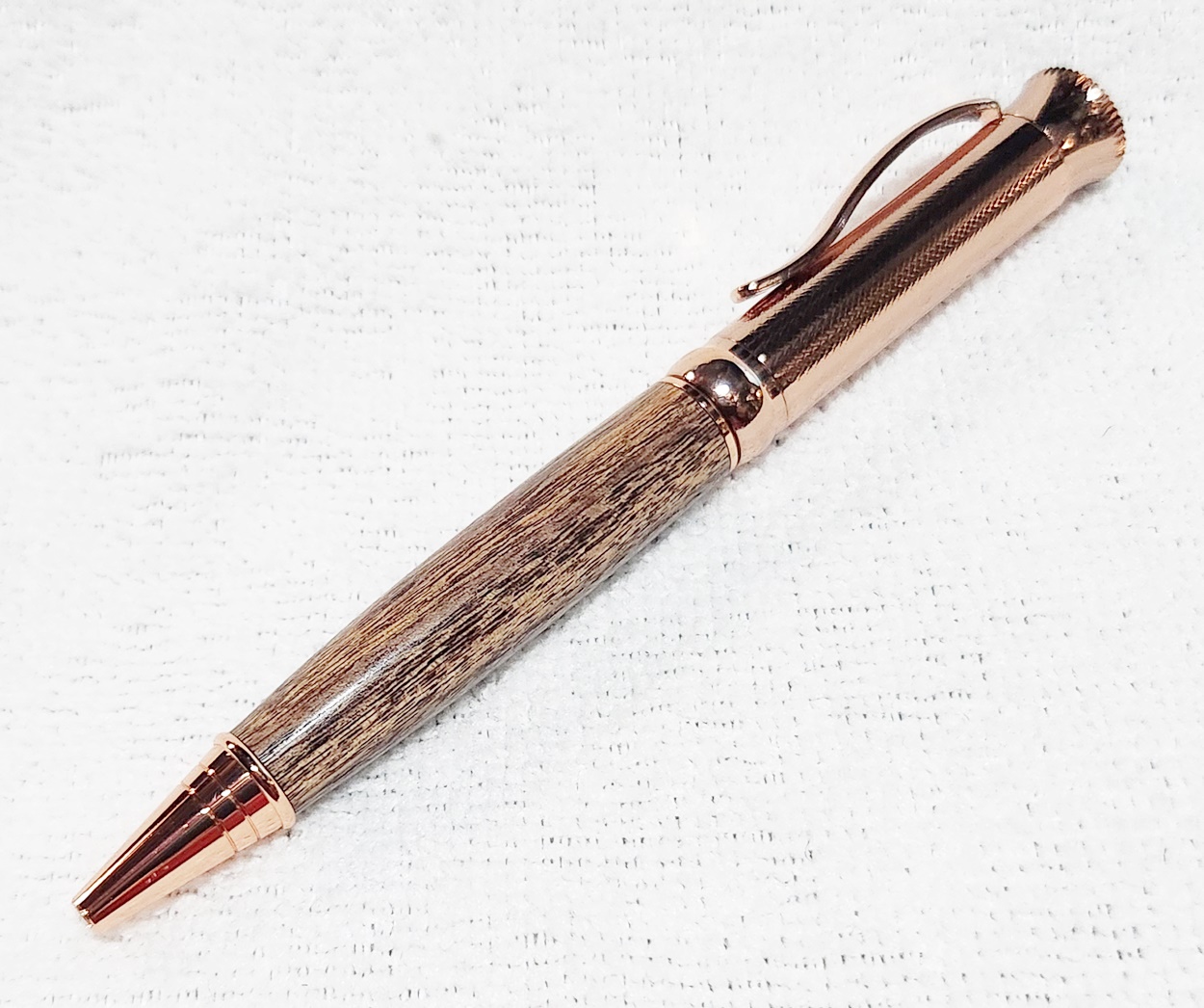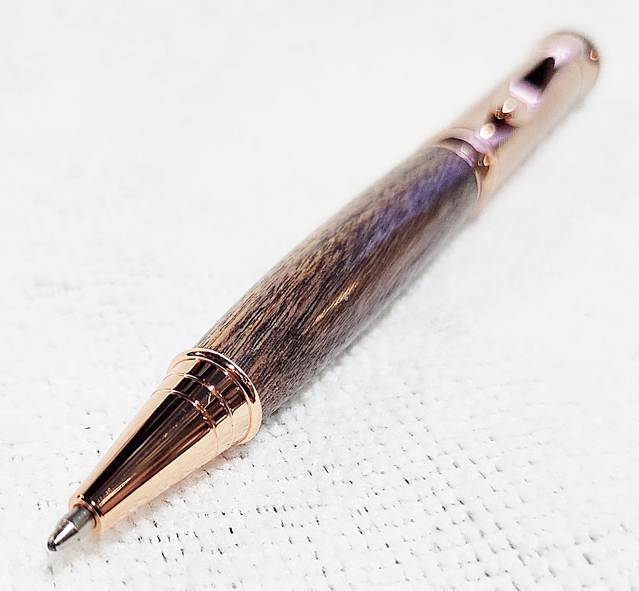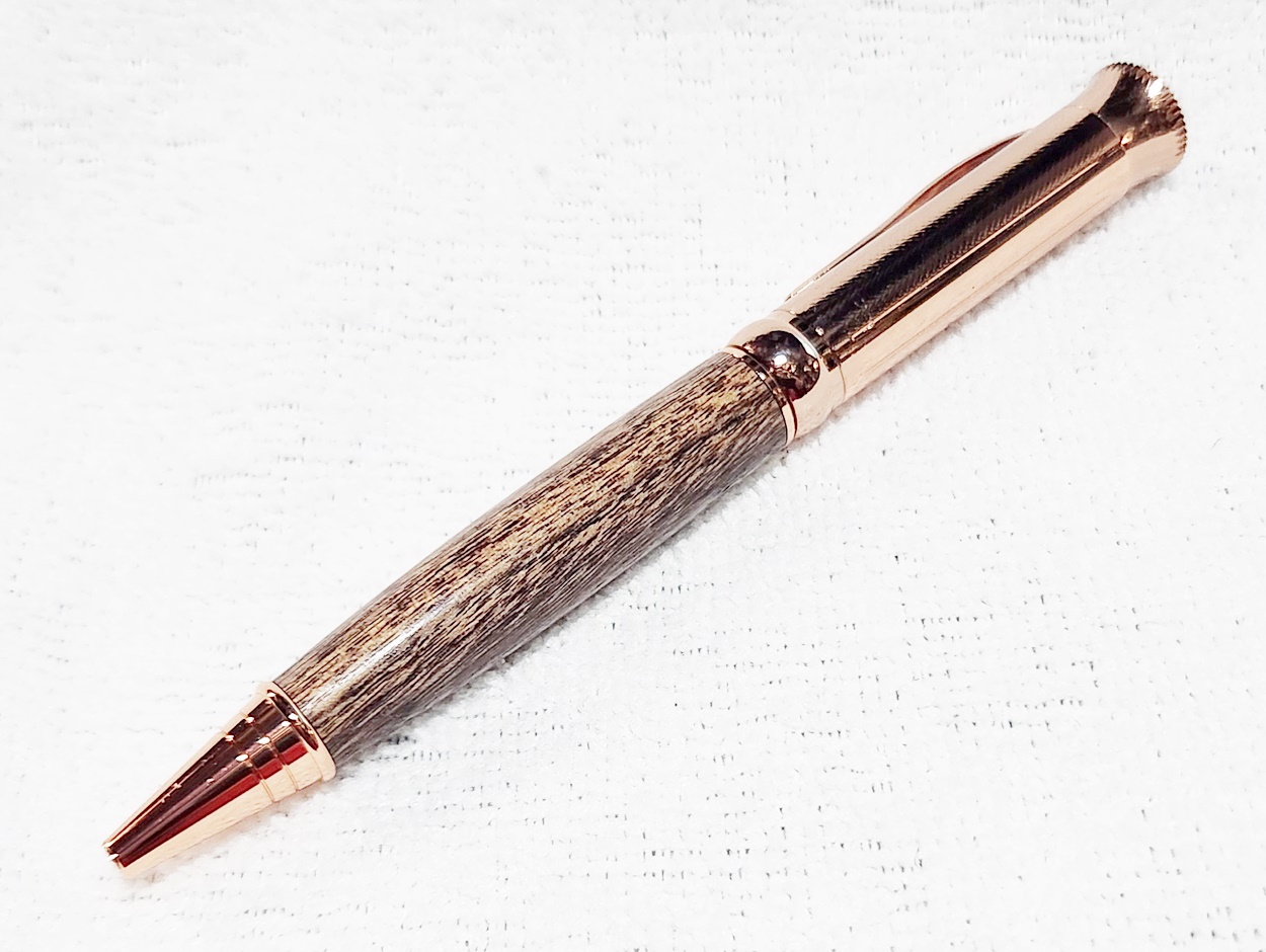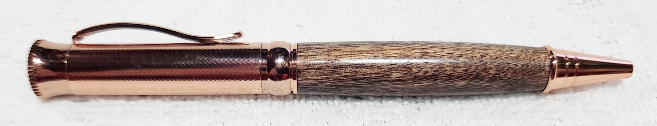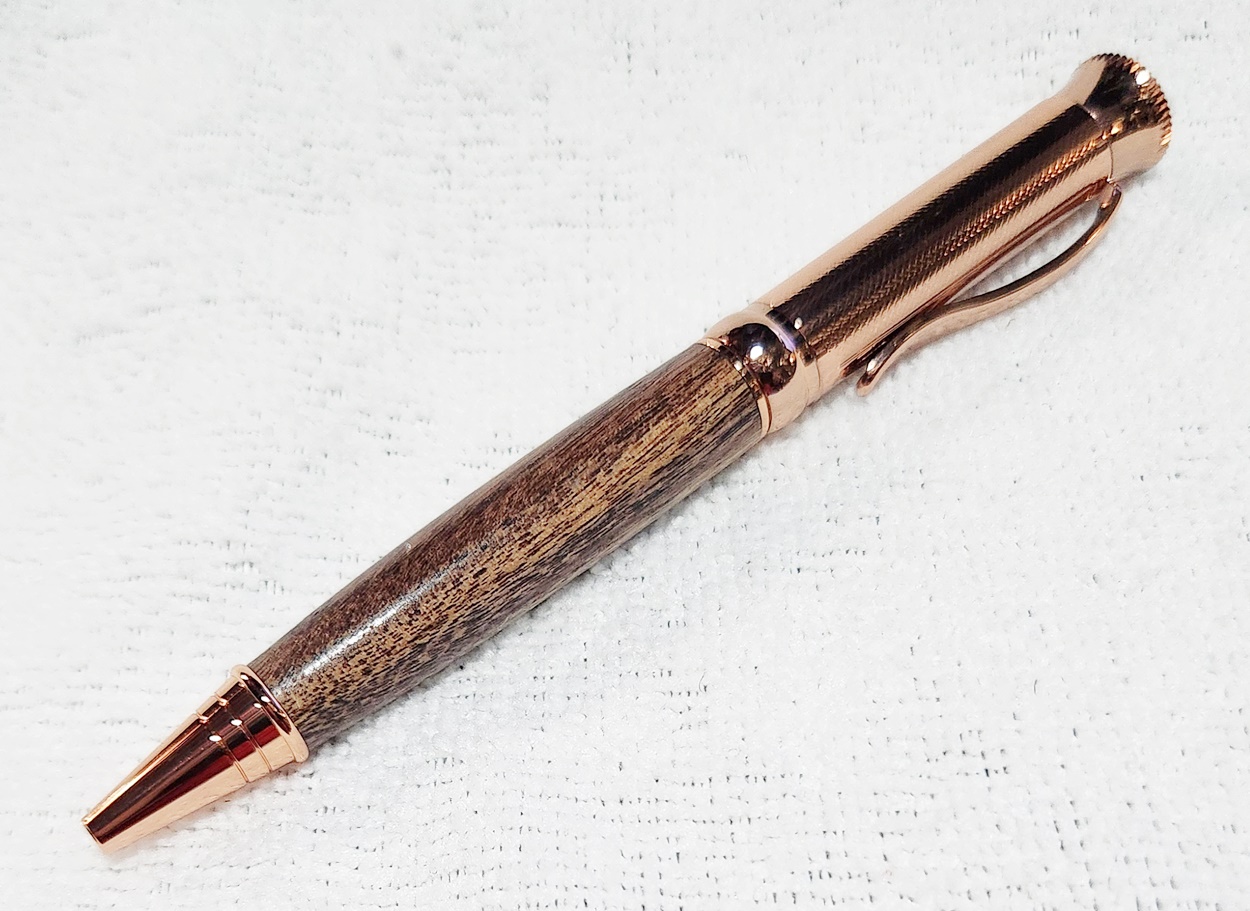 Another Simplicity twist pen in copper from Exotic Blanks. The Patagonian rosewood is from Woodcraft. The finish is Pens Plus.