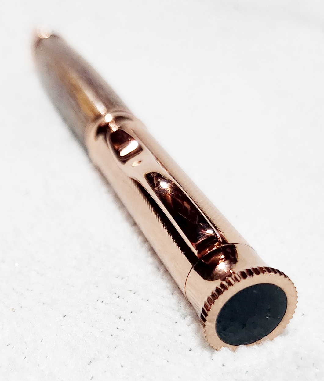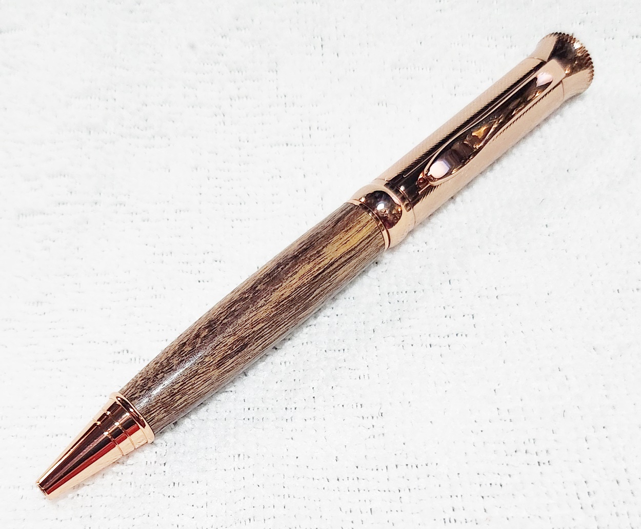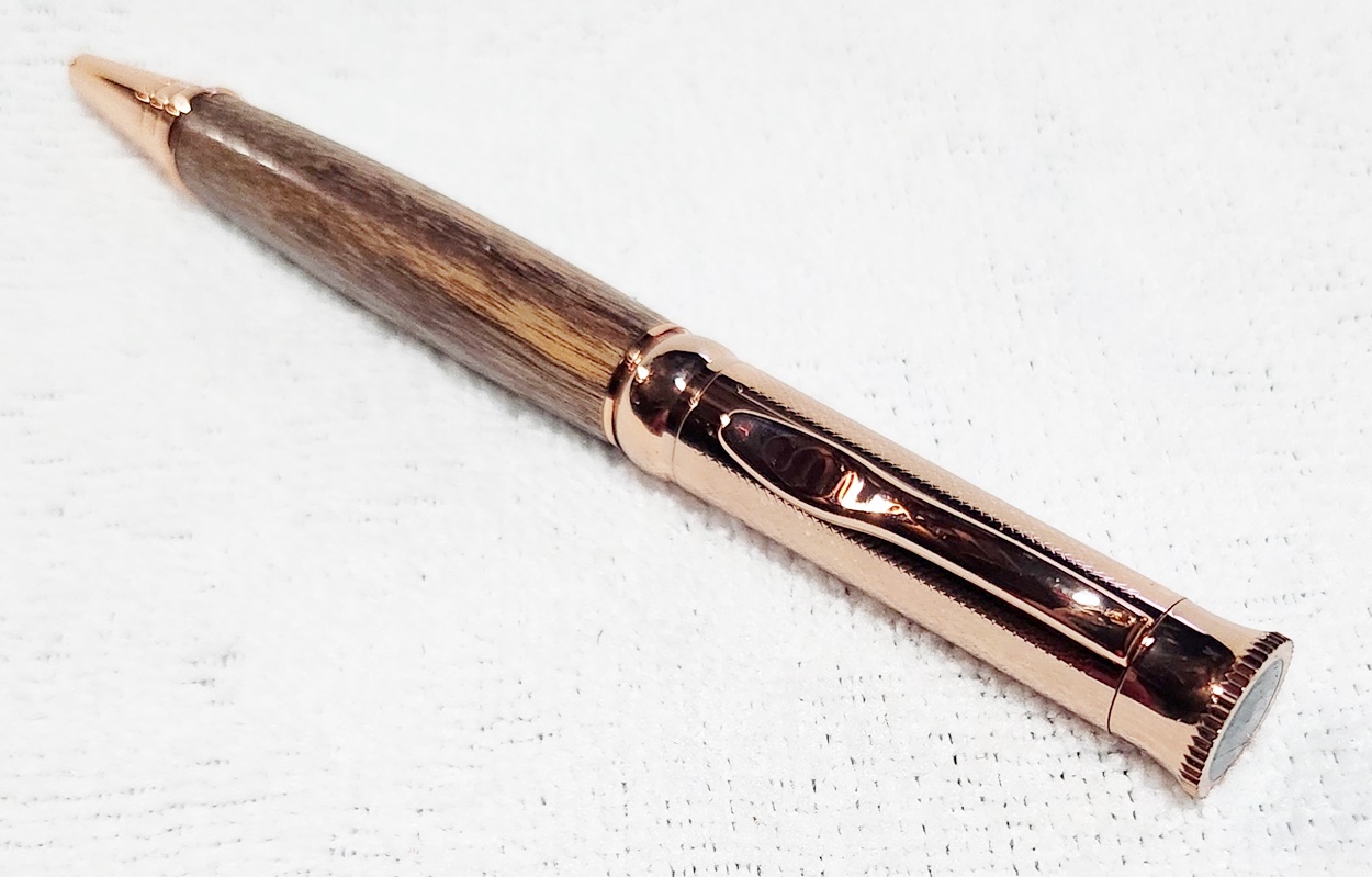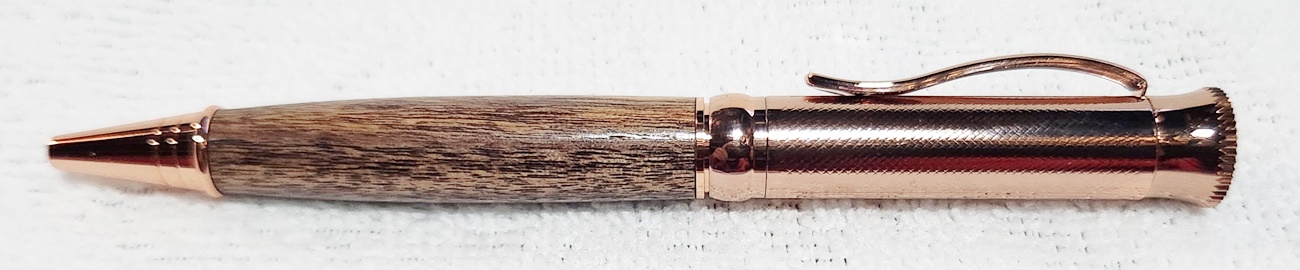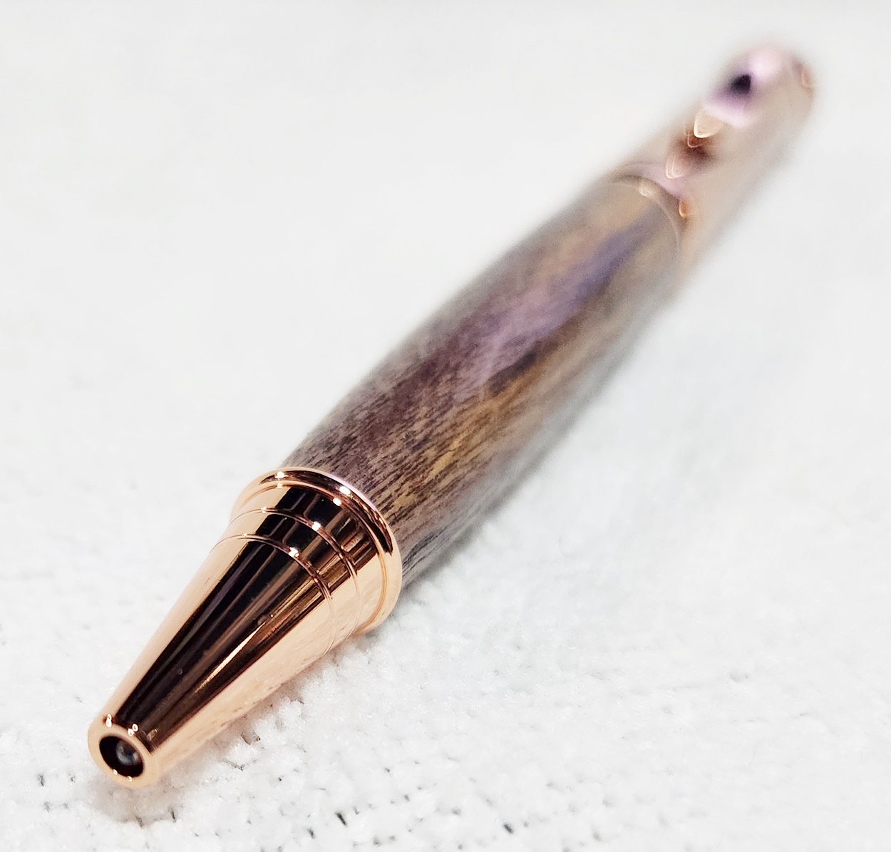 Another Simplicity twist pen in copper from Exotic Blanks. The Patagonian rosewood is from Woodcraft. The finish is Pens Plus.