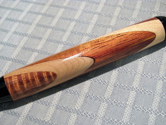 He used Koa,Walnut and Maple.On the one in the foreground the thin black stripes are black construction paper he said.I want to experiment using that on my next homemade wooden blanks.