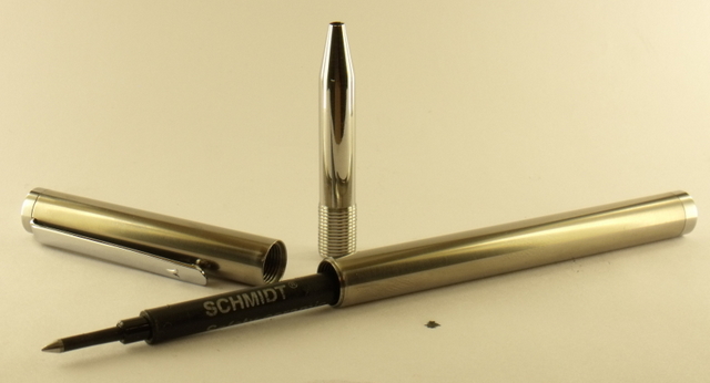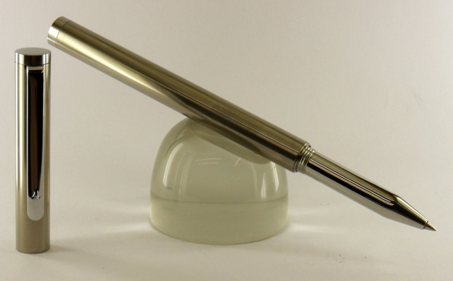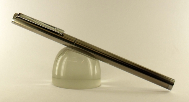 I don't think custom pens get more basic than this, but I do think it has a little elegance about it.:wink: At 10mm max OD, and a nib diameter of only 7.5mm, it's pretty skinny. Titamium body and cap, stainless steel nib and finials and a recessed chrome slimline clip.