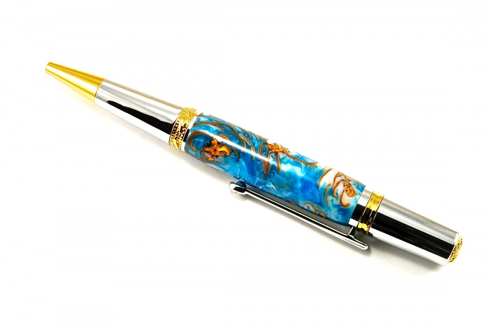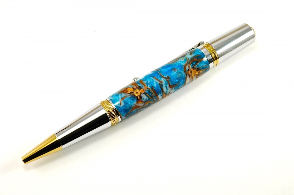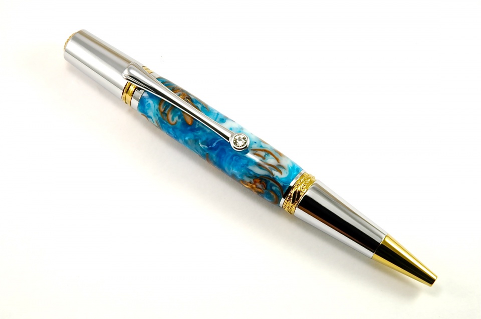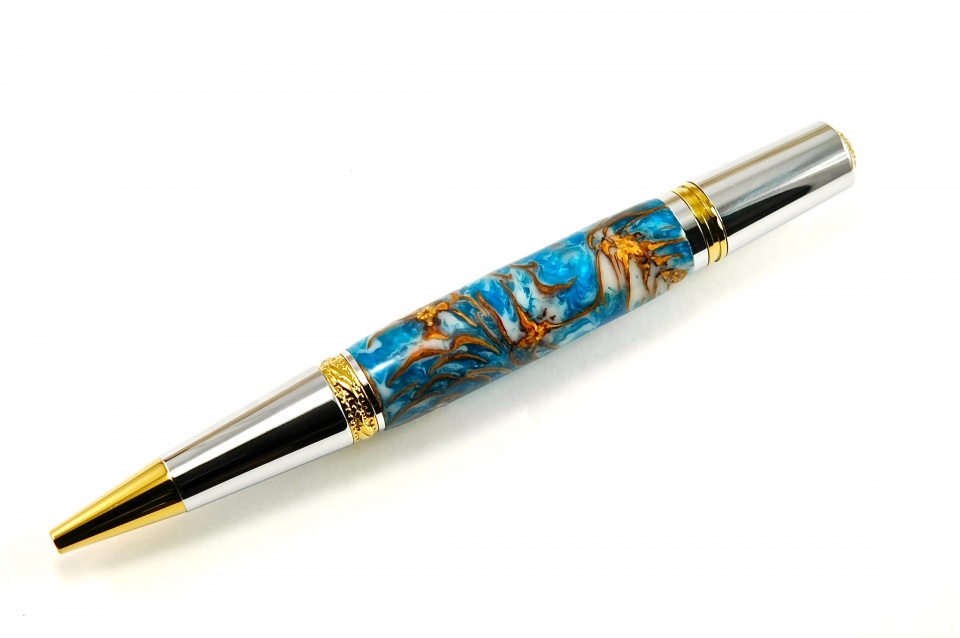 I made this over the weekend. Alumilite is just awesome. I can pop in some mini-pine cones, pour my AL, mix, split and color it, pour it into the mold, slide it in my pressure pot, wait a bit, take it out, de-mold the blank, cut it to size, drill it, glue the tube in, let it dry, throw it on the lathe and turn it and finally, apply the finish to it, all in about 2.5 hours. Ya gotta love it, especially when they come out this beautiful!