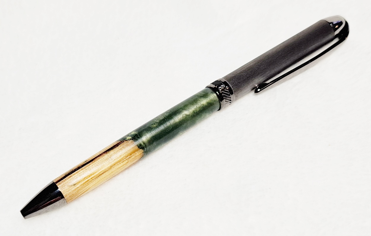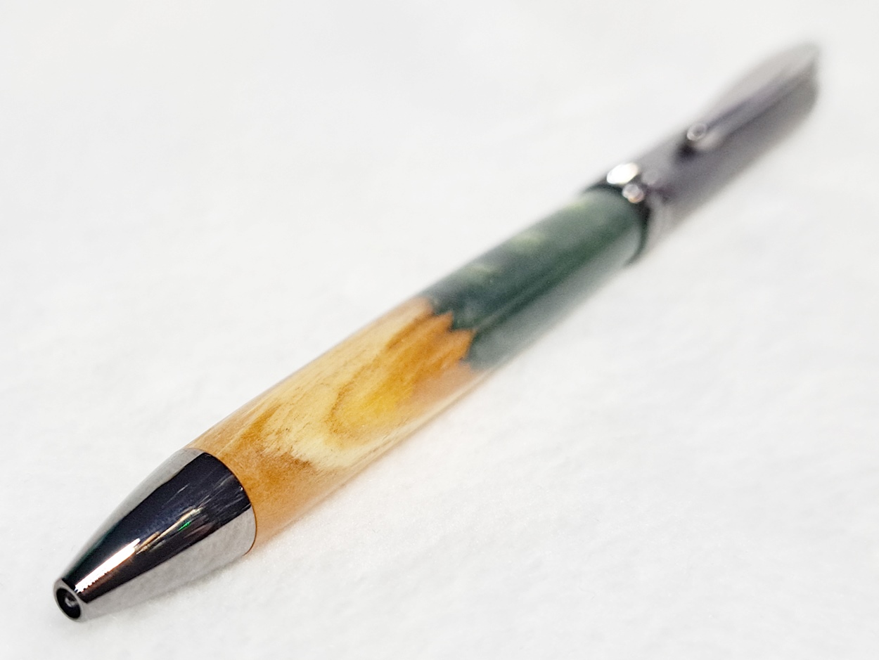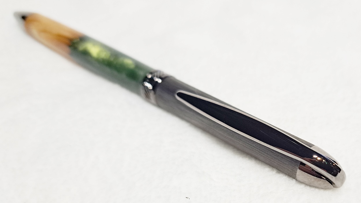 This is a Slim Hybrid twist pen from Woodcraft. The blank is a hybrid cast by my friend Dennis, that I'm calling Toxic Onion. I sanded it to 600, and finished it with Pens Plus. I probably should have sanded it to 1500 or 3000, but it's not bad. Another fantastic Dennis hybrid blank!