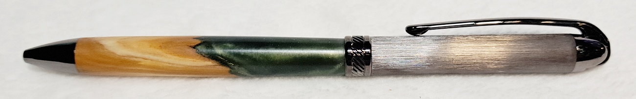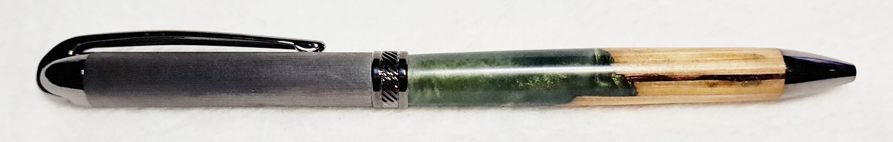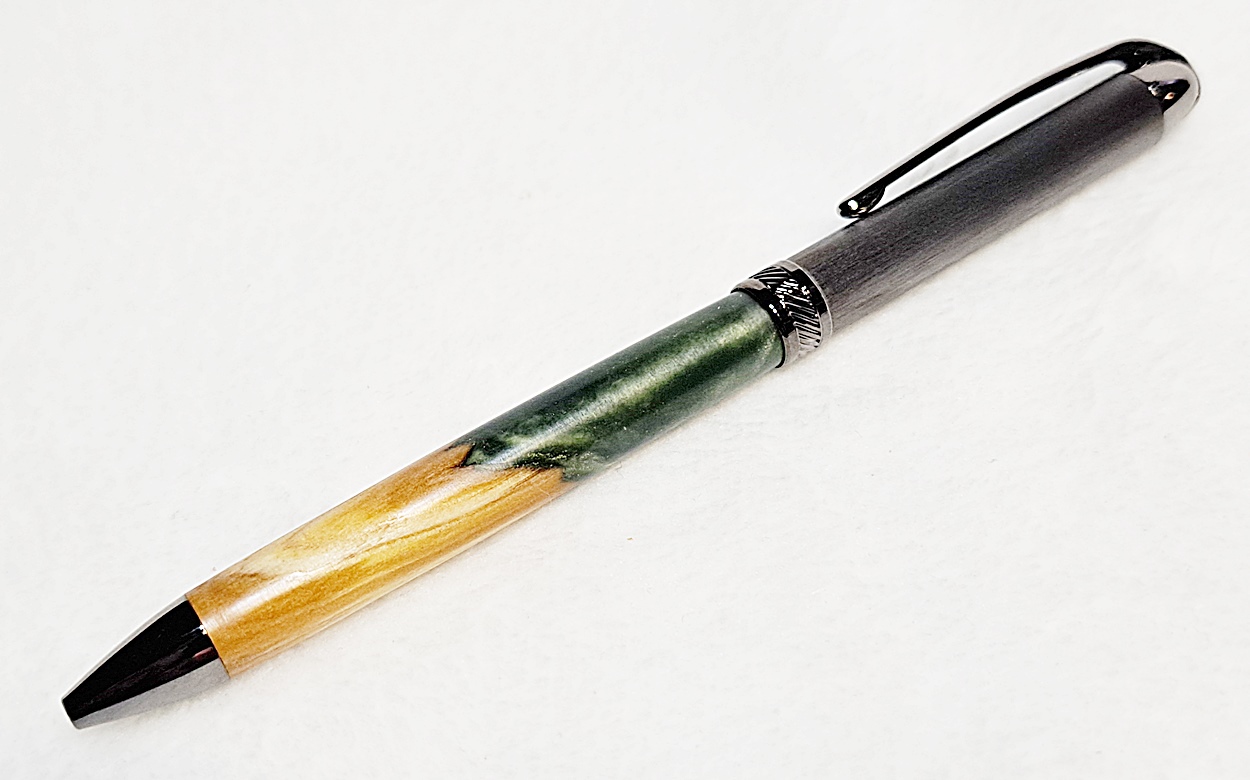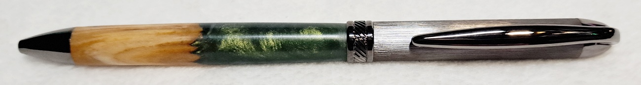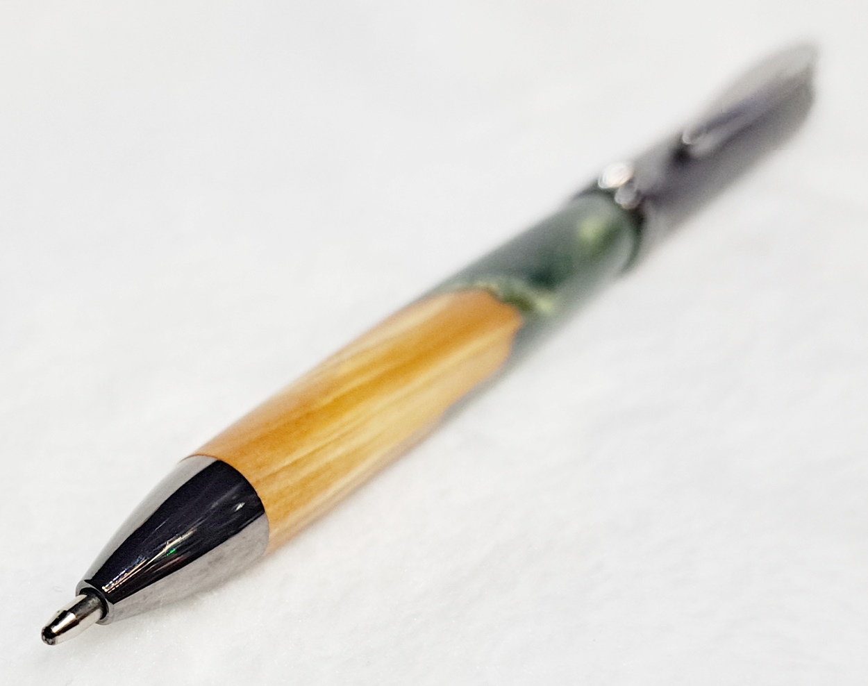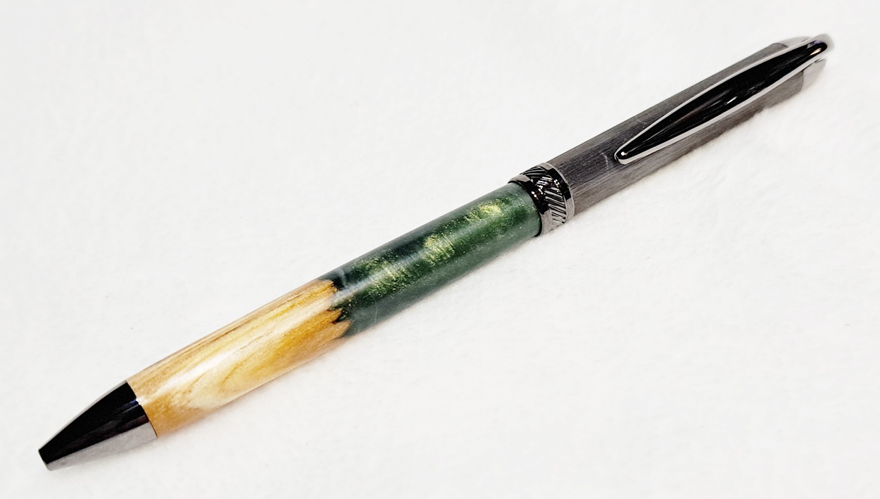 This is a Slim Hybrid twist pen from Woodcraft. The blank is a hybrid cast by my friend Dennis, that I'm calling Toxic Onion. I sanded it to 600, and finished it with Pens Plus. I probably should have sanded it to 1500 or 3000, but it's not bad. Another fantastic Dennis hybrid blank!