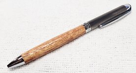 This is a Slim Hybrid twist pen in gunmetal and chrome, from Woodcraft. It's the same as the Berea Surfix. The wood is macacauba, also from Woodcraft. The finish is Pens Plus.