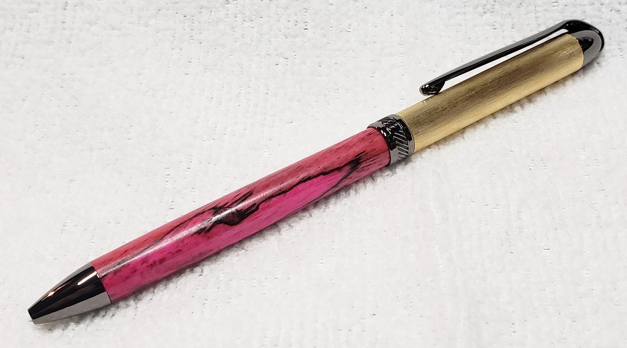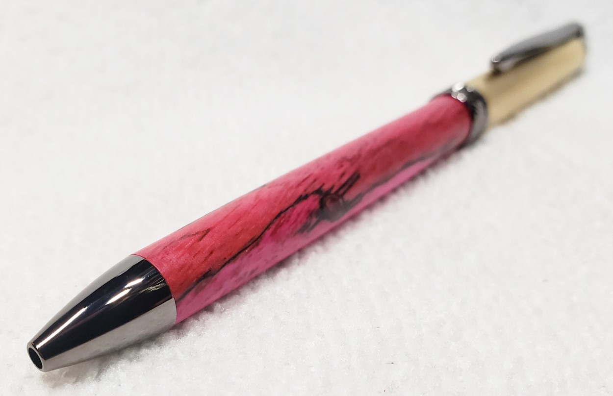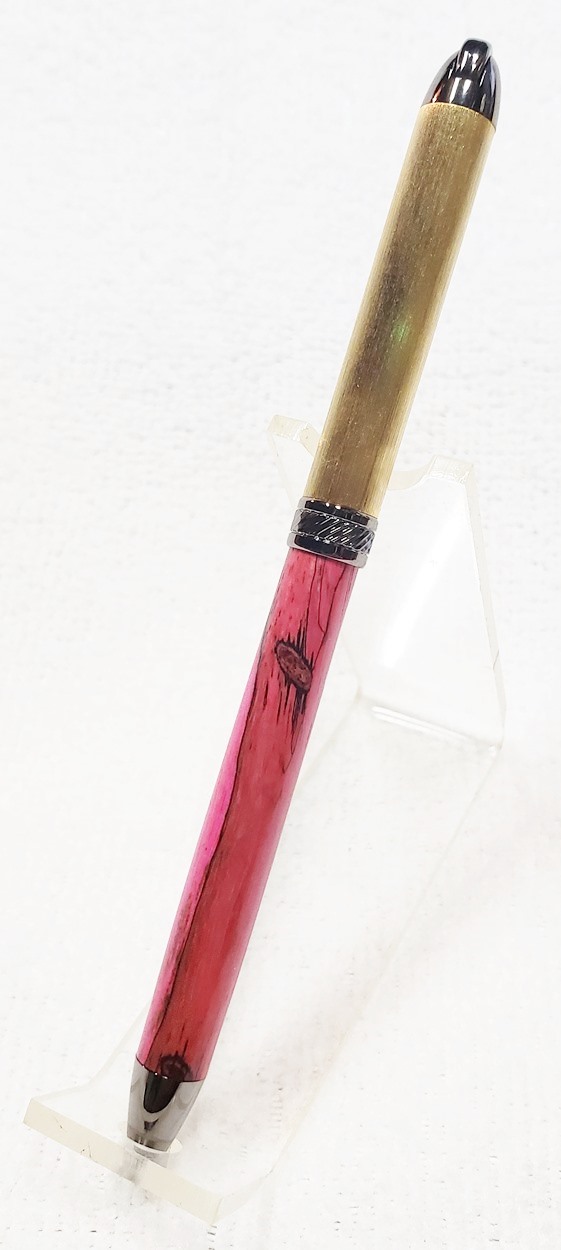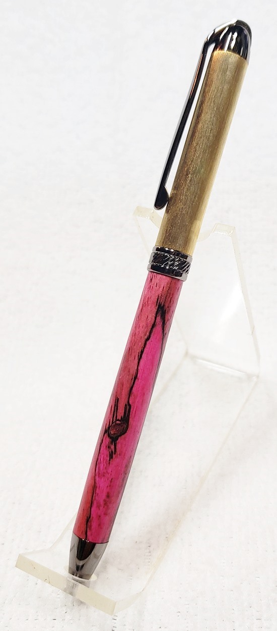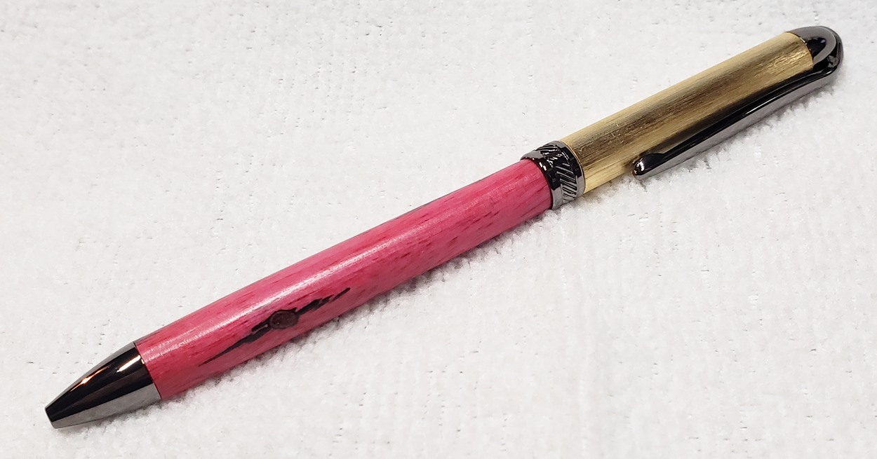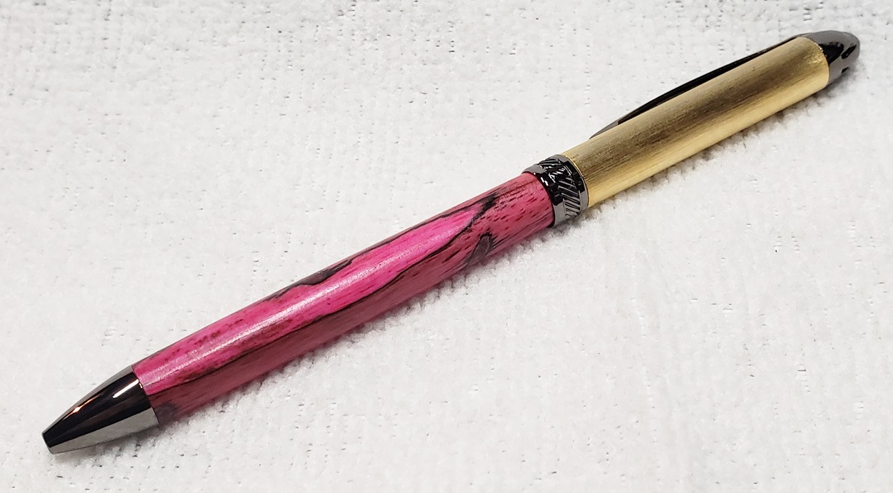 My son and daughter-in-law are having a gender reveal party today. I'm going to be a papa! They asked me to make a couple of pens to give to friends who helped organize the party. The second pen Heather chose was a Slim Hybrid from Woodcraft, in brushed gold and gunmetal. (It's a Surfix pen from Berea. I don't know why Woodcraft changes the names of pens.) She chose a stabilized spalted tamarind blank, dyed pink, also from Woodcraft. Made a nice looking pen!