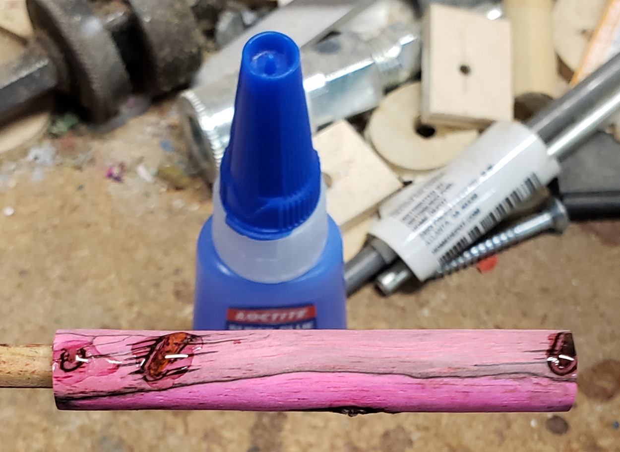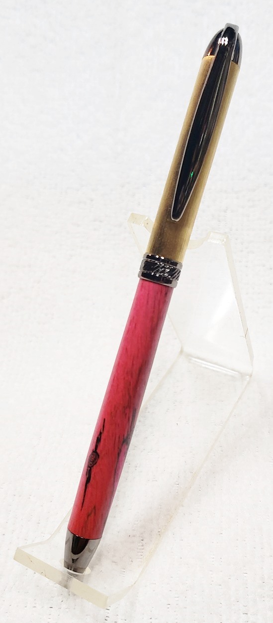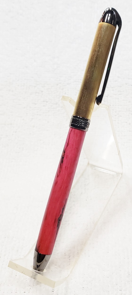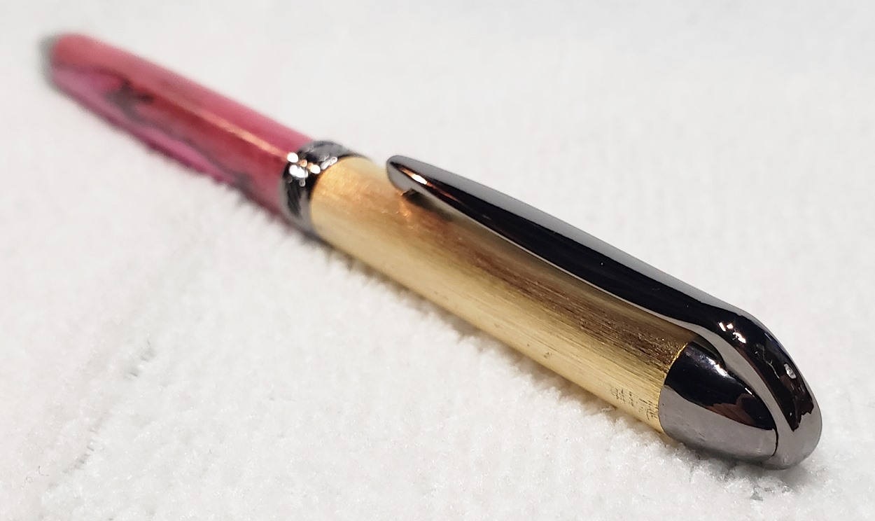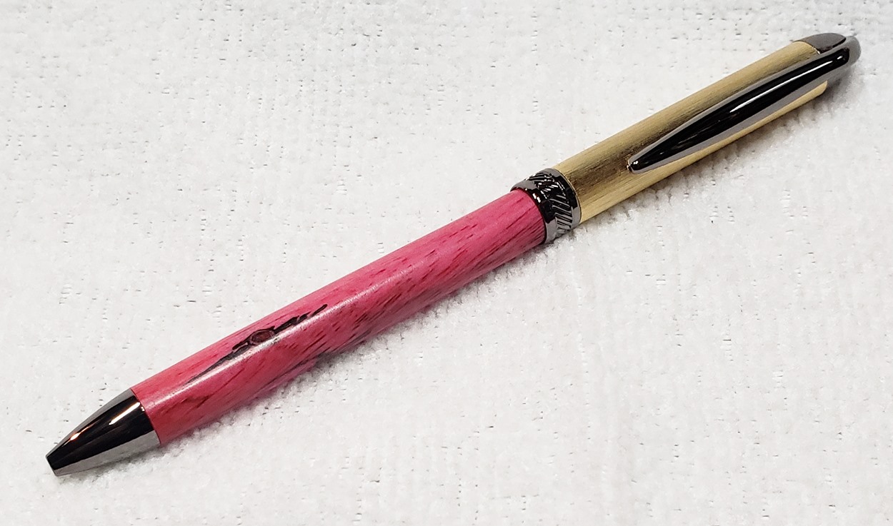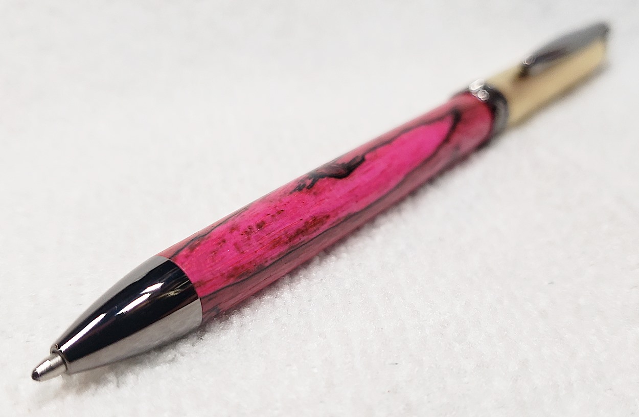 My son and daughter-in-law are having a gender reveal party today. I'm going to be a papa! They asked me to make a couple of pens to give to friends who helped organize the party. The second pen Heather chose was a Slim Hybrid from Woodcraft, in brushed gold and gunmetal. (It's a Surfix pen from Berea. I don't know why Woodcraft changes the names of pens.) She chose a stabilized spalted tamarind blank, dyed pink, also from Woodcraft. Made a nice looking pen!