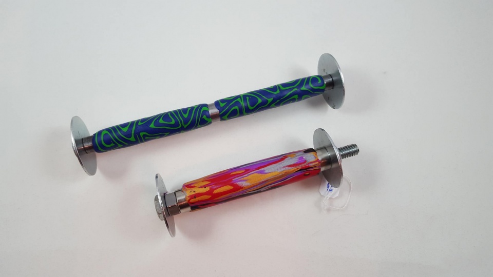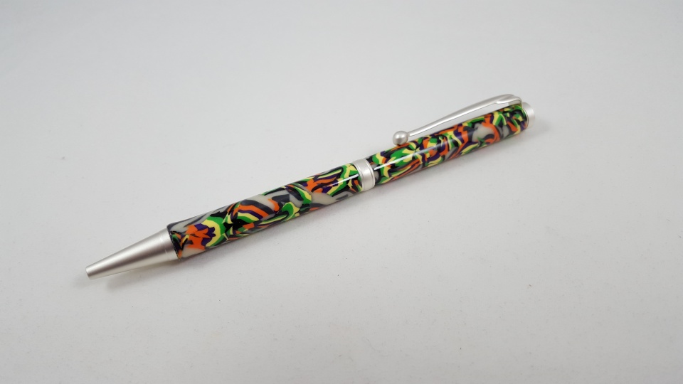 Now, having off from work has its advantages, way too much time to kill. Stack some colors, cut into whatever shapes, roll it up, bake, cool, then try to turn it. Went for broke with a slimline. The clay held up, no chip out. Very light weight, Montverdi refill, small flare at the bottom. I'll keep this one. Thanks for looking.