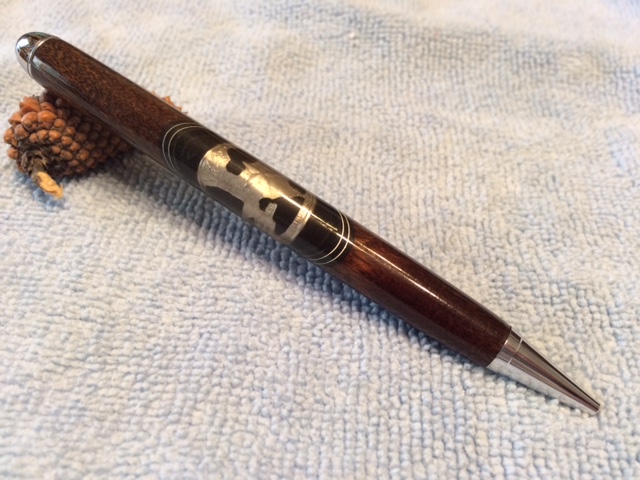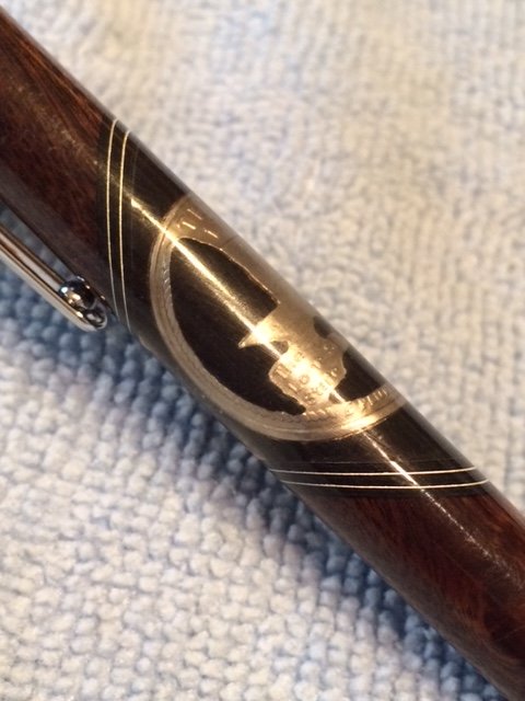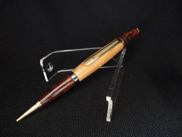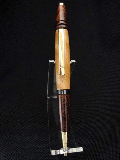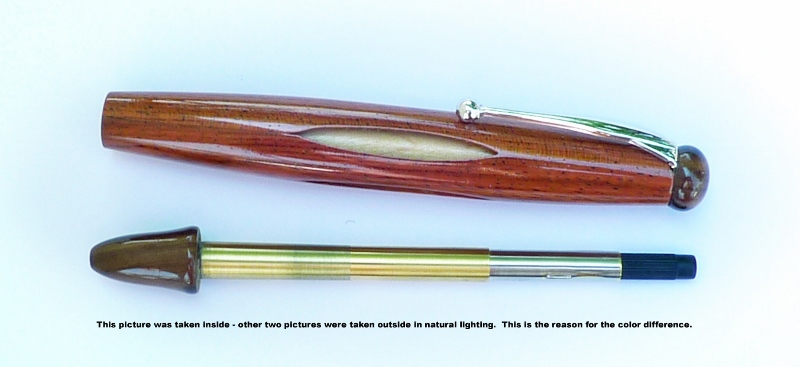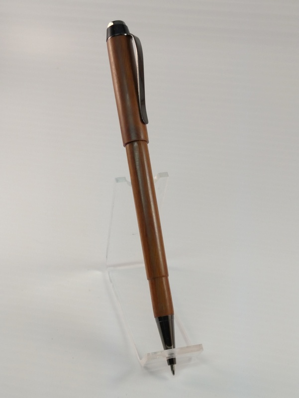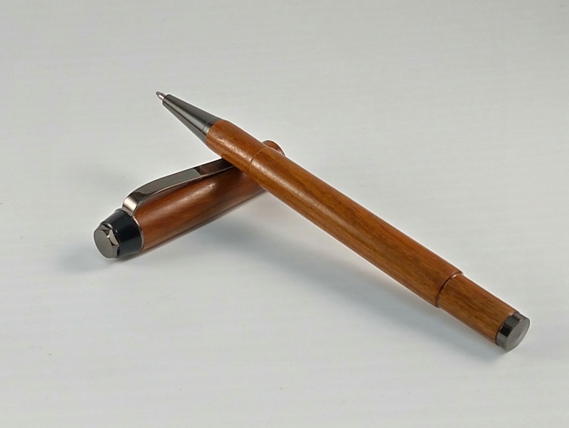 Its made from a hunk of African Rosewood. Its a Capped, Postable Gunmetal Slimline. I used a Cigar clip and tube for the cap. The point stays out all the time since it's a capped pen but due to the shortened length of the pen, twisting the nib pushes on the back of the pen pushing out the nib and giving you something to grab on to.
