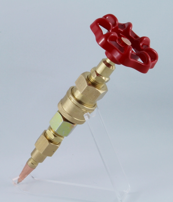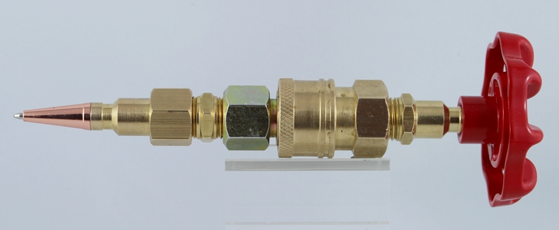 I used a slimline kit with copper-plated parts, retaining the nib, the finial, and the tubes, and discarding the clip and the centerband. The barrel is assembled from brass pressure washer connectors, each shaped on the lathe, or drilled, or reamed as necessary to accommodate the brass pen tubes, refill, nib, and finial. All the parts used are commercially available. The red tap handle at the top end is also a commercially available part, modified to fit the design.