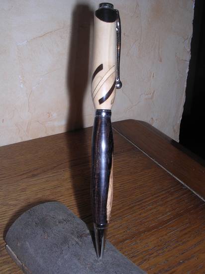 Very good job with the inlays but I think the pen would have had a much smoother look if you just forgot about the centerband. You obviously have the skill for a custom centerband, I'd go that route.