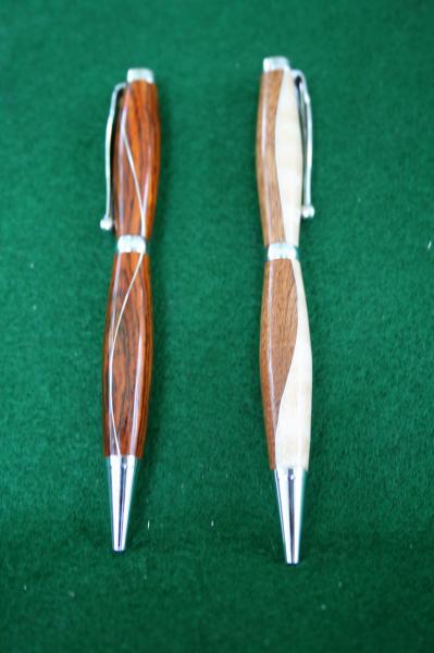 The darker pen Cocobolo is my first attempt at a metal inlay running vertically in a pen. The two tone is a couple of tries later, it is Curly Maple and Spanish Cedar.