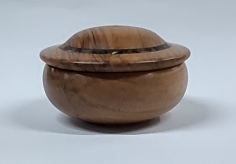 Small Cherry keepsake box, 2" x 3 1/4" in dia. Green Abalone shell inlay. Sanded and buffed with a home made sanding paste, no other finish.