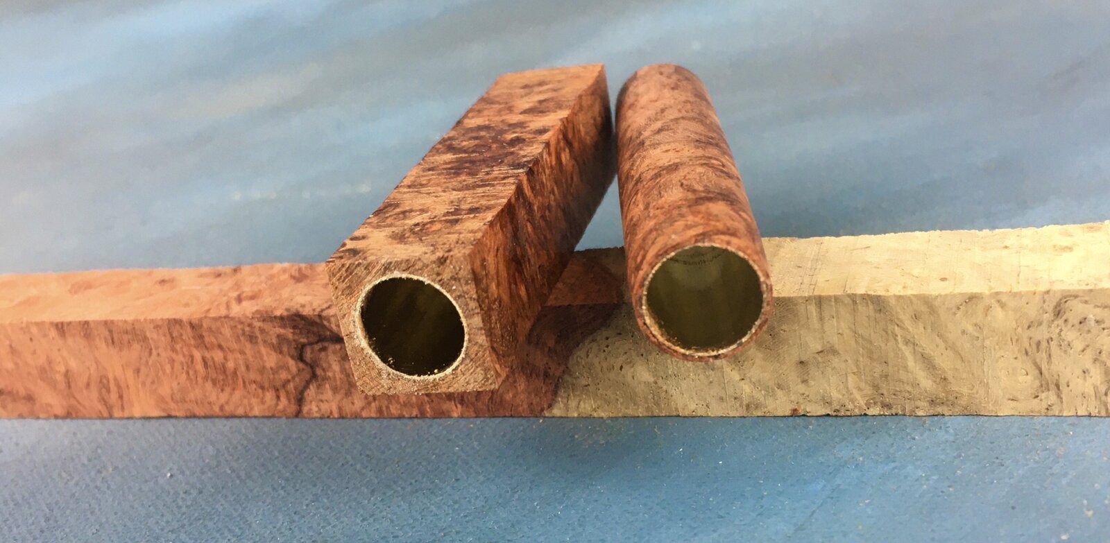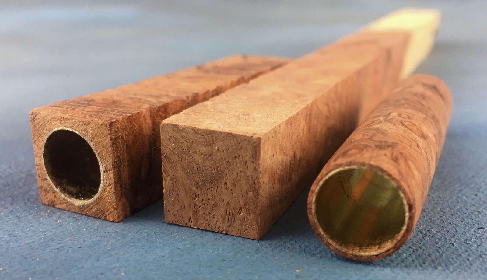 After cutting it into 3/4" square pieces there was quite a bit of 1/2" pieces left. A Sierra pen is just under 1/2" so I made a couple of Saturn blanks and used pieces to attempt drilling for Sierras on the lathe. Here are the results; straight through and even! The turned Sierra, an unturned, tubed blank and the original stock is shown. Whew!