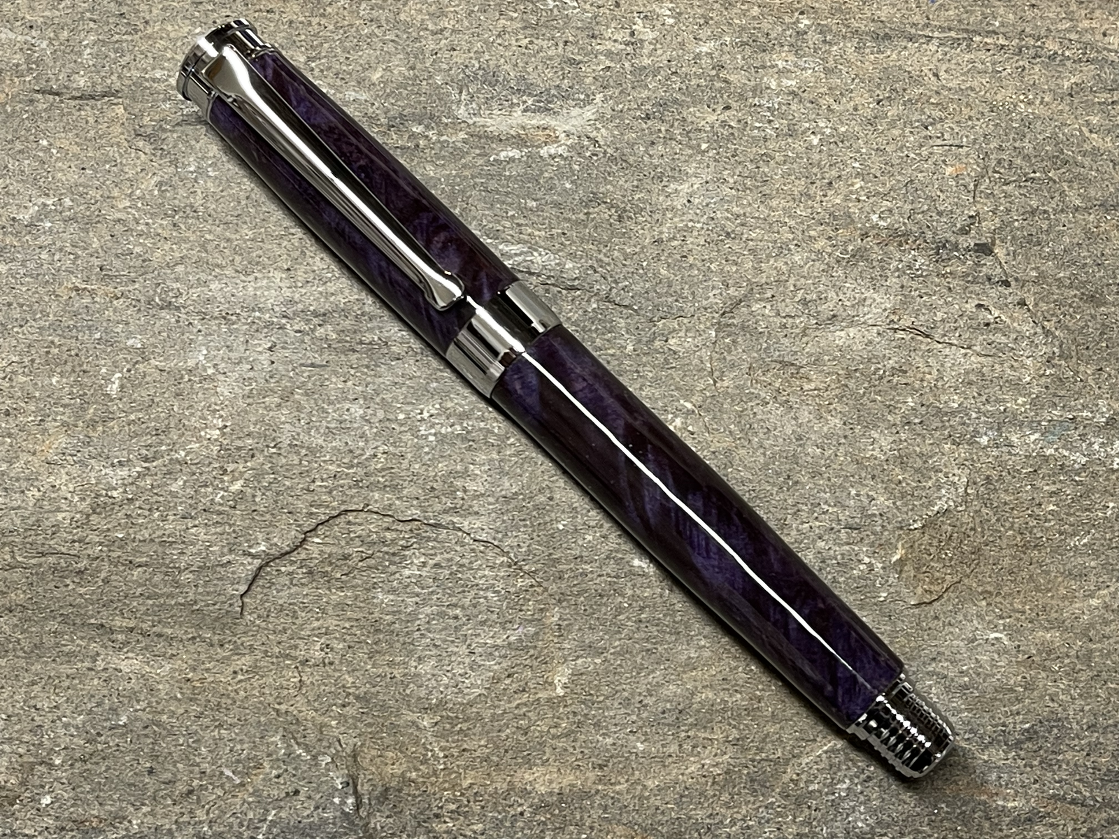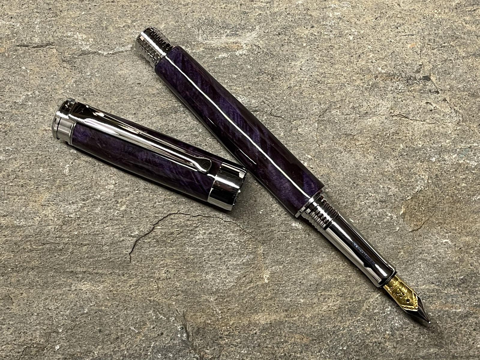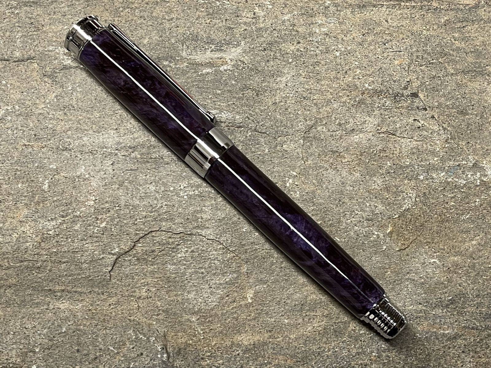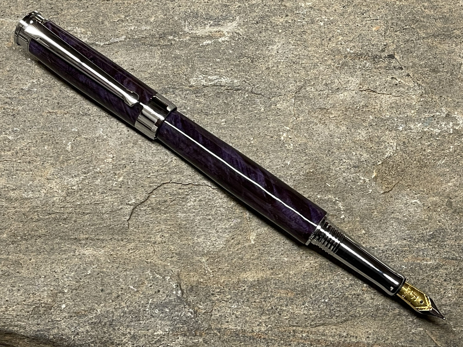 Special order fountain pen out the door! Deep Purple dyed box elder burl on a chrome Leveche with upgraded nib. I really like this kit! Glides across the page.