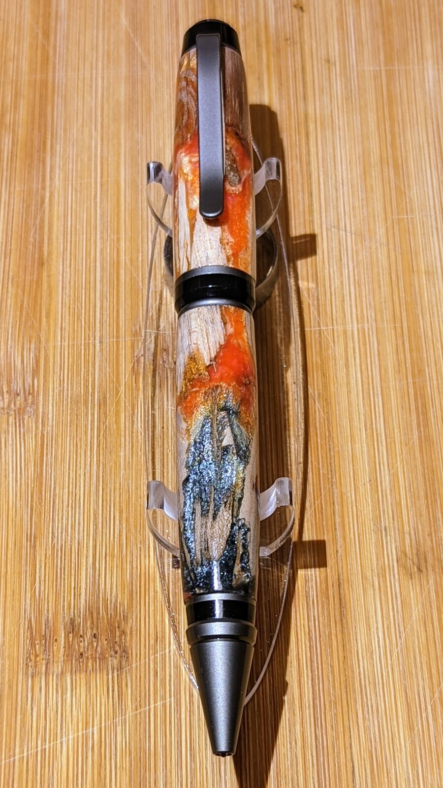 Tonight I finally finished a kit with a blank that I've had laying around for a few months. While smoking a pork loin awhile back, I thought that the chips that I use might look good in resin. I was going for more of a red and orange flame look, but they blended together more than I had planned by the time that the resin made it through all of the wood chips.