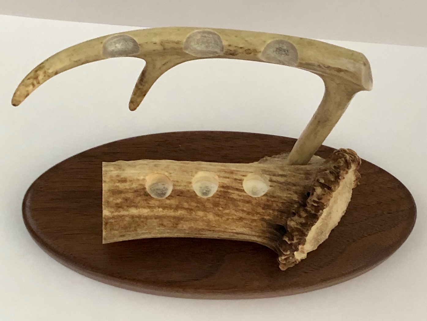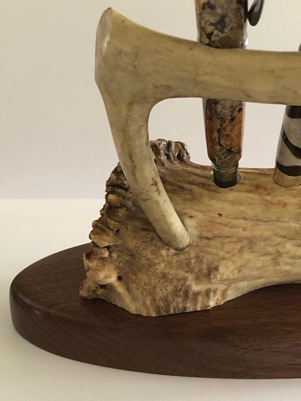 The last set is a piece I entered in an art competition this past weekend at the Illinois Taxidermy Associations yearly event. The requirement was it had to be made from real animal parts..... Clear cast Ringneck Pheasant Feathers, Whitetail Deer Antler in resin, and clear cast Corn Snake, (the corn snake pen was made and show on here a while ago, but it fit the theme and is one of my personal favorites.) The base is an Elk Antler and the back rest is a small whitetail deer antler piece on a walnut oval. I was proud to win a 1st place blue ribbon.
