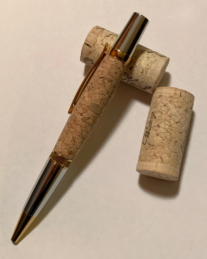 The second is another one of the wife's pens. She asked me to make a cork pen for her years ago. I finally finished it. I epoxied two wine corks together, drilled and epoxied the tube in. I turned most of it with carbide tool and then sanded the rest to shape so I didn't blow it up. No finish applied.... just the feel of cork.