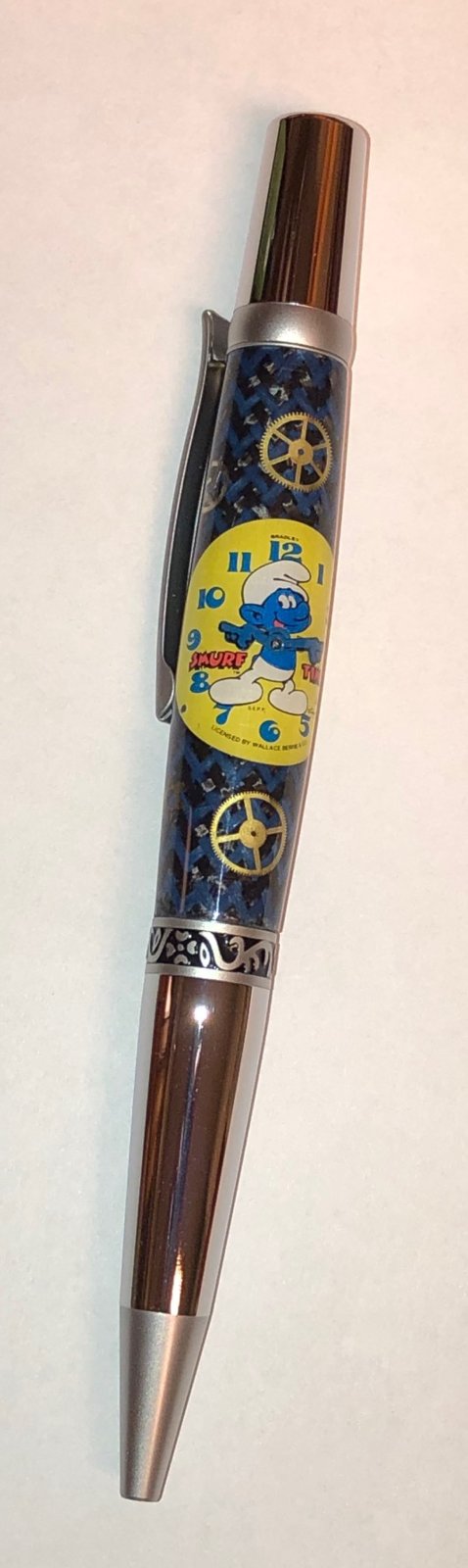 The first is a Smurf watch part pen of blue and black woven Kevlar. My wife claimed it even before I made it, as she looked over the watches I had stashed.